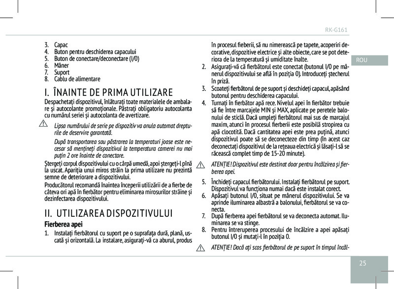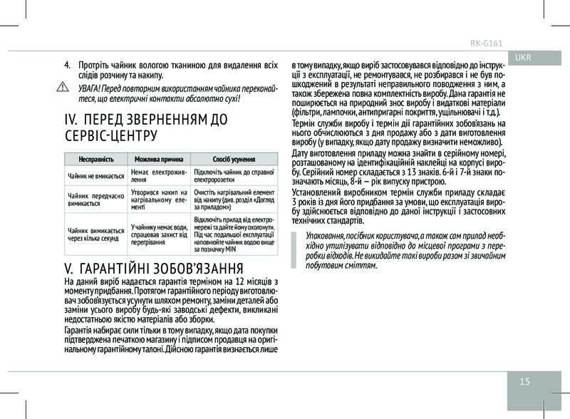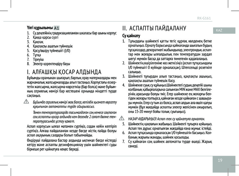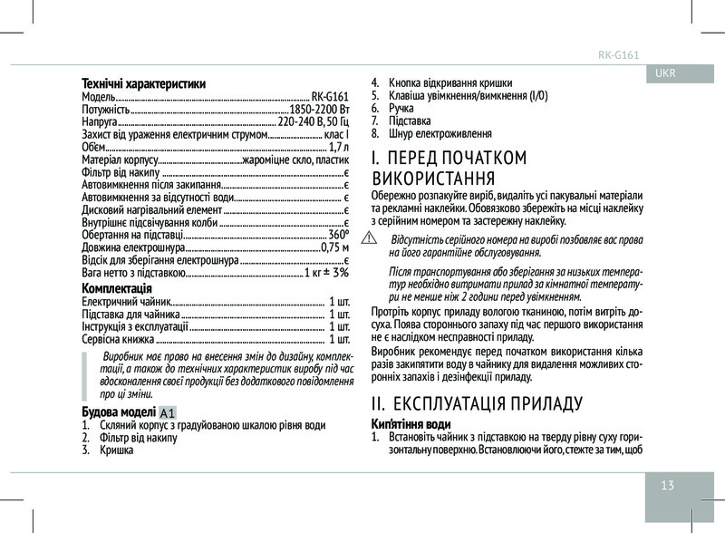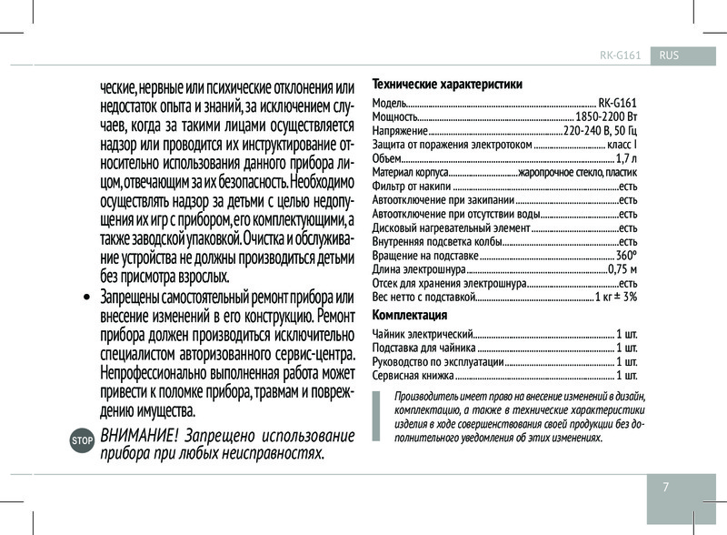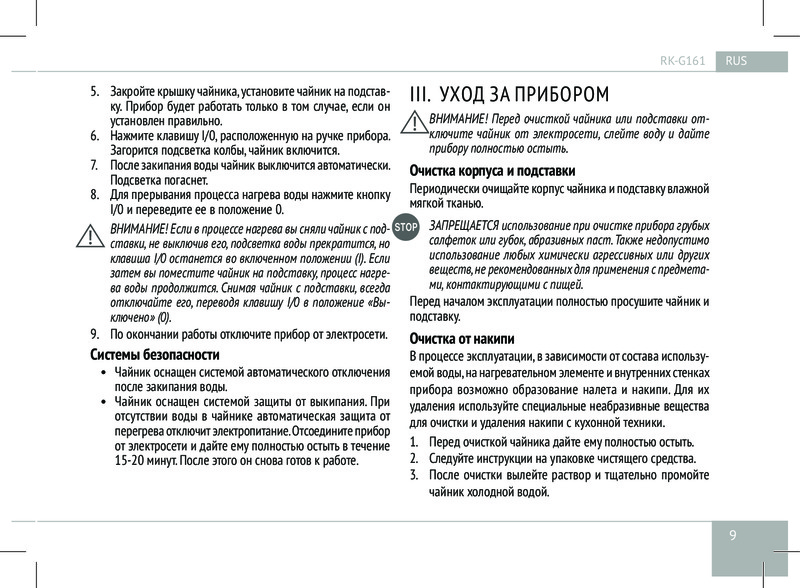 Чайник G161 имеет дисковый нагревательный элемент и подставку, благодаря которой устройство можно вращать на 360°. Практичный фильтр от накипи сделает каждый глоток чистой и вкусной воды ещё более желанным. Наряду с автоматическим отключением при закипании, для лучшей безопасности предусмотрено автоотключение и при отсутствии воды внутри прибора.
