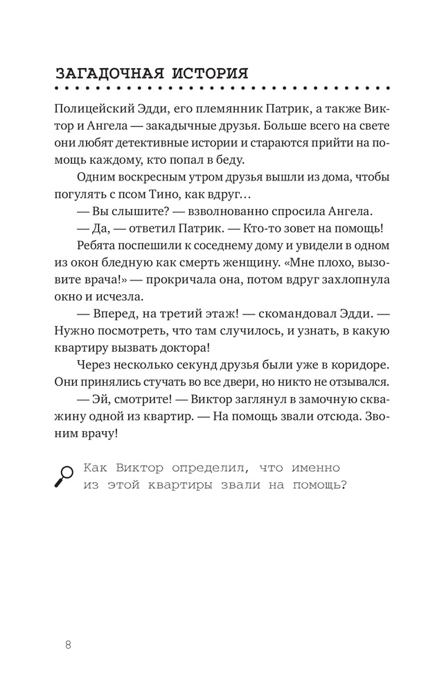 Истории интересные, но уж больно короткие - текст на треть странички всего. Загадки поначалу показались не такими уж простыми, ребенок 10 лет голову ломал (хорошо, что есть ответы!), потом втянулись (или загадки стали больше на внимательность,чем на логику?). "Приключения черной руки" мне понравилось больше, т.к. там 4 полноценных детективных расследования и каждая страница продолжает предыдущую, а здесь отдельные истории и, повторюсь, очень короткие.