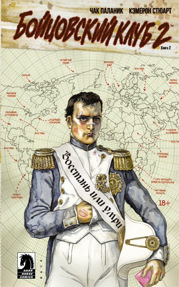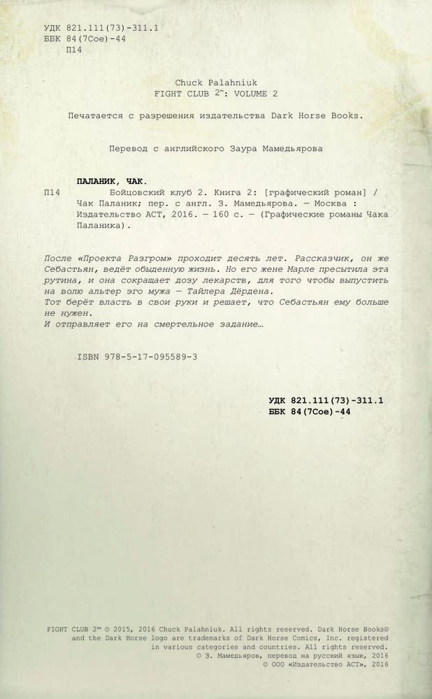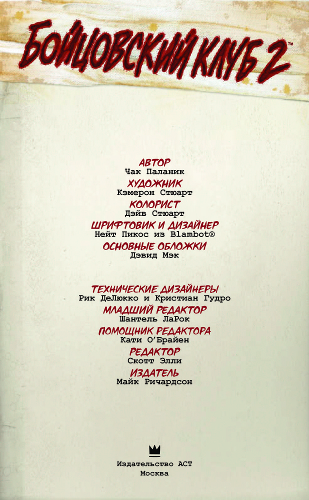 Все закончилось? Последняя страница? Ура! Я справился. Это было трудное и долгое путешествие… на дно. Когда же я думал, что глубже опуститься нельзя, со дна постучали. Я никогда не был фанатом Чака Паланика, однако находил его книги небезынтересными, наполненными идеями, пусть местами спорными и неоднозначными. Чего скрывать – “Бойцовский клуб 2” ждал с момента анонса. Первая книга была хороша, из-за нее было сломано немало копий в дружеских спорах, да и влияние на общество она оказала вполне ощутимое. Помню студенты устраивали собственные бойцовские клубы, где выбивали друг из друга дурь. Говорят помогало. Наконец вышел первый номер продолжения. Но ведь по первому номеру не судят, особенно лимитированные серии. Дадим сюжету разгуляться и посмотрим сразу на первый том. Себастьян (так теперь зовут героя первой книги) живет с Марлой и малолетним сыном простой человеческой жизнью. Заботливые родители балуют парня и дарят ему набор юного химика, ведь в роду у них не было ни одного шизофреника-пиромана. Себастьян глотает таблетки горстями, дабы не выпустить свое альтер-эго, ведь лоботомия пистолетом могла не помочь окончательно, да и люди вокруг будто бы ждут возвращения Тайлера. В первую очередь ждет сама Марла, заменяя лекарства мужа плацебо. Почему? Потому что от таблеточек у Себастьяна не стоит. Внимание вопрос – что может пойти так? Первые ласточки заметны уже в самом начале. Как же это человек совсем не изменился, пройдя через все описанное в первой книге? Снова столики из Икеи и трусость. Далее фигура Тайлера – из анархиста он почему-то превращается в капиталиста. Целые мыльные фабрики, поставка наемников и услуги, тянущие на срок от пары месяцев до пожизненного. Свежей идеей видится лишь ввод самого автора в контекст повествования в качестве камео. Получилось остроумно… Как мне тогда казалось. Паланик никогда не отличался любовью к людям, на что можно списать инертность Себастьяна, а Тайлер… Наверное у него есть план и для него нужны деньги, только и всего. Интерлюдия. Паланик хорош своими финалами. Часто половина книги проходит в догадках, к чему же автор так все закрутил и запутал. Ярким примером может послужить “Рент: биография Бастера Кейси” или тот же “Бойцовский клуб”. Плюс натуралистичные подробности и откровенная насмешка над читателем. Все это дает надежду на то, что все сюжетные линии распутаются и все станет ясно. Второй том должен принести ясность, как всегда яркий конец заставит извилины работать и можно будет вновь до хрипоты выяснять что же пытался донести до нас автор! Второй том. Сюжет набирает обороты. У Тайлера действительно есть грандиозный план, кажется, что ему уже ничто не может помешать. Марла ввиду сюжетных обстоятельств ищет пропавшего сына по всему миру. Себастиан ловит свой хвост (простите, гоняется за Тайлером). Не берусь сказать когда все переходит границу реальности и уносится в сюрреализм. Наверное в момент рассказа Тайлера о себе, о том, как он появился. А может быть в момент появление убитого в первой книге персонажа. Ах да, еще штурм замка детьми, больными прогерией. И все это до девятого номера. Интересные мысли по ходу чтения? Конфликт? Нет, забудьте. Конфликт исчерпал себя еще в первой книге, а нового не случилось. Обычные заигрывания с абсурдом превращаются в нечто нечитабельное и наконец