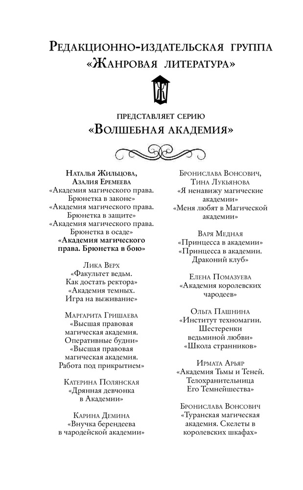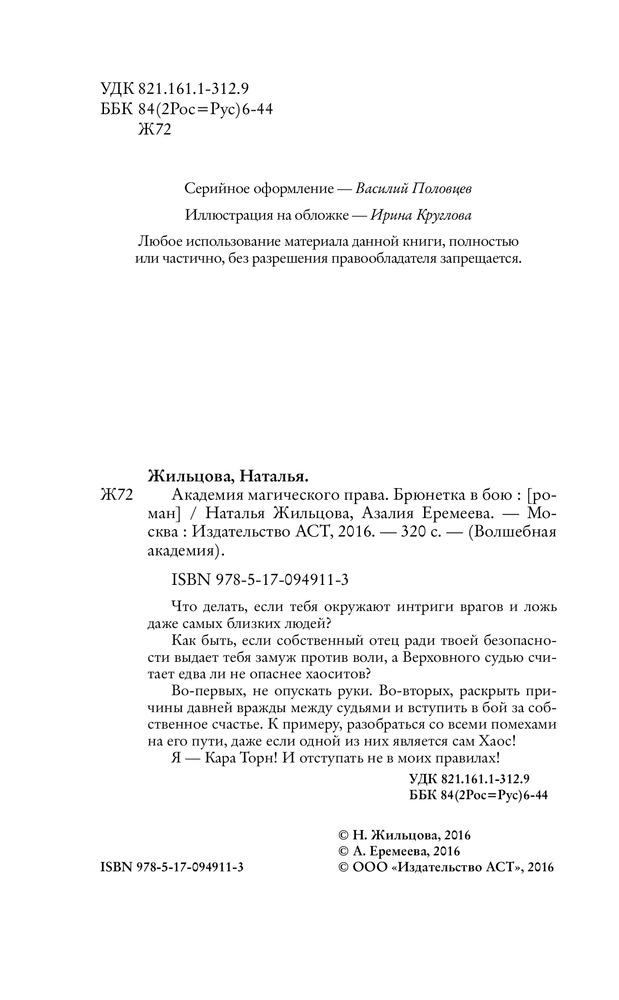 Академия магического права. Брюнетка в боюАзалия Еремеева, Наталья Сергеевна Жильцова В данный момент этот товар отсутствует в продаже. Возможно, у нас найдется аналогичный или похожий товар здесь. Серия: Волшебная академия Что делать, если тебя окружают интриги врагов и ложь даже самых близких людей? |