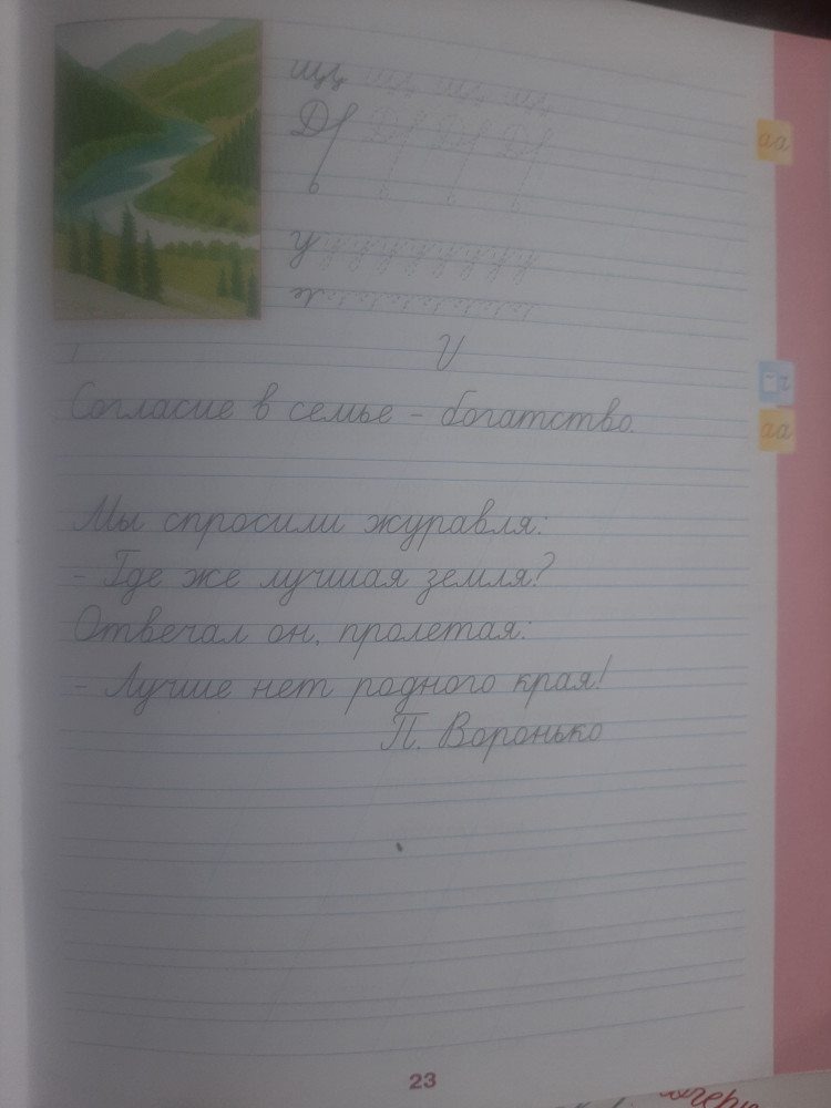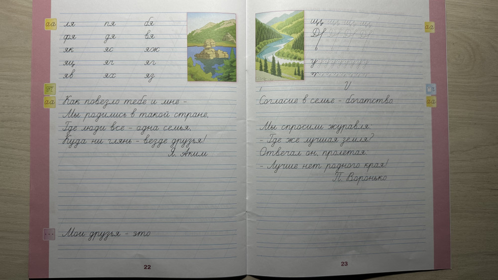 Бумага хорошего качества. Шрифт крупный, чёткий. Картинки яркие, красочные. Взяли три ступени. Будем все лето тренироваться, исправлять почерк.