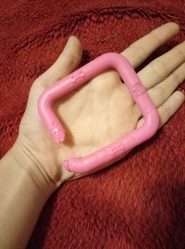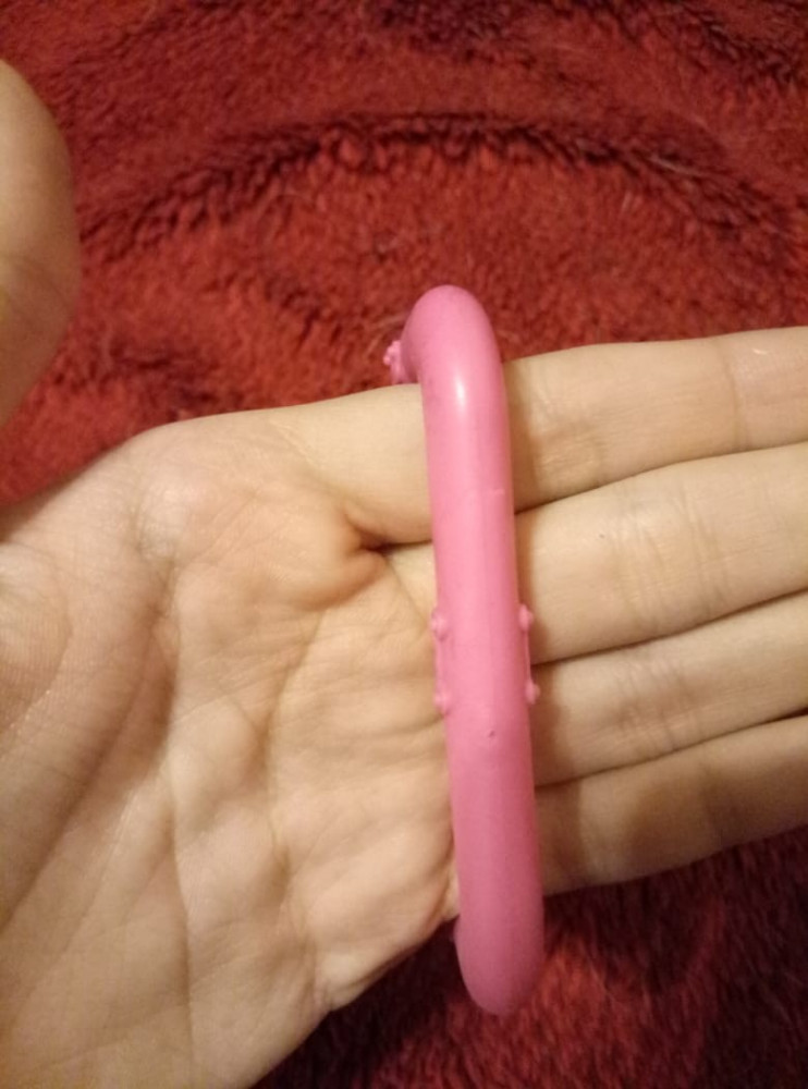 Обычная резиновая жевательная игрушка. Пришла в розовом цвете, что очень порадовало, т.к. у нас девочка. Без упаковки. Без запаха резины. Играем каждый вечер))))
