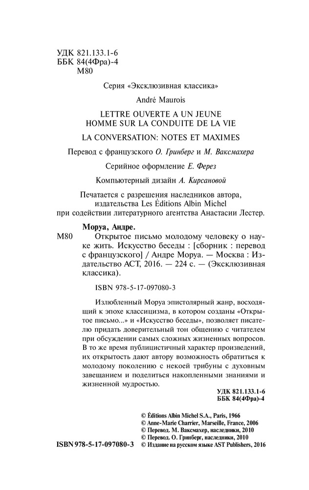 Открытое письмо молодому человеку о науке жить. Искусство беседыВ данный момент этот товар отсутствует в продаже. Возможно, у нас найдется аналогичный или похожий товар здесь. Серия: Эксклюзивная классика Излюбленный Моруа эпистолярный жанр, восходящий к эпохе классицизма, в котором созданы «Открытое письмо...» и «Искусство беседы», позволяет писателю придать доверительный тон общению с читателем при обсуждении самых сложных жизненных вопросов. В то же время публицистичный характер произведений, их открытость дают автору возможность обратиться к молодому поколению с некоей трибуны с духовным завещанием и поделиться накопленными знаниями и жизненной мудростью. |