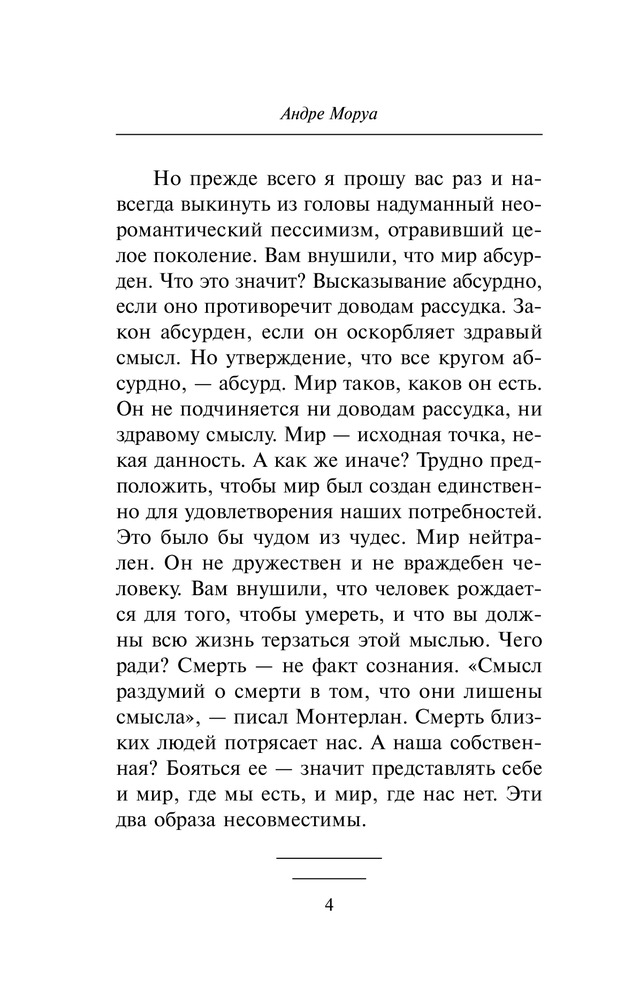 Андре Моруа (André Maurois, настоящее имя Эмиль Саломон Вильгельм Эрзог) - французский писатель и член французской академии. Впоследствии псевдоним стал его официальным именем. Родился в местечке Эльбеф близ Руана в состоятельной семье обратившихся в католицизм евреев из Эльзаса. В шестнадцать лет, учась в Руанском лицее, получил степень лиценциата. По совету одного из своих преподавателей вместо продолжения учебы в Эколь Нормаль поступил служащим на суконную фабрику своего отца. Во... |