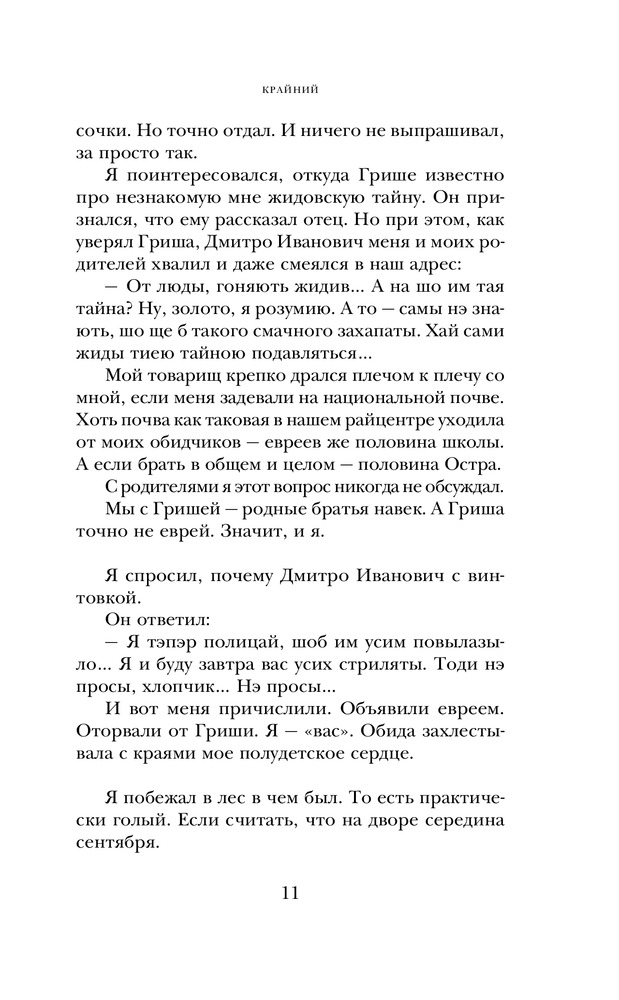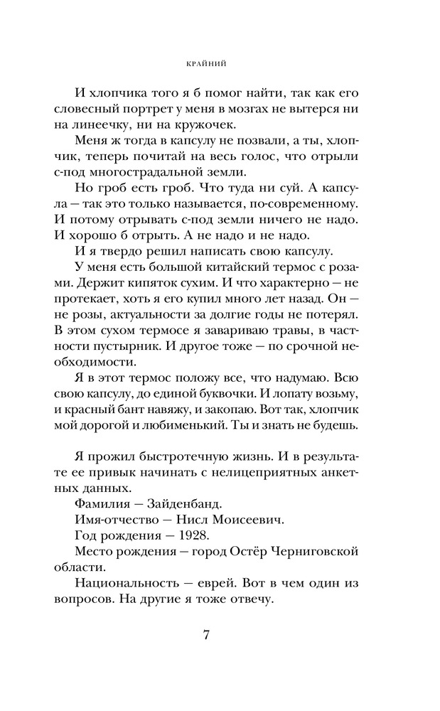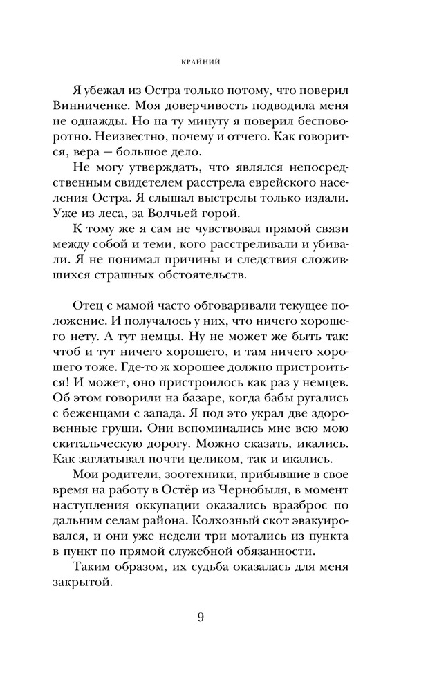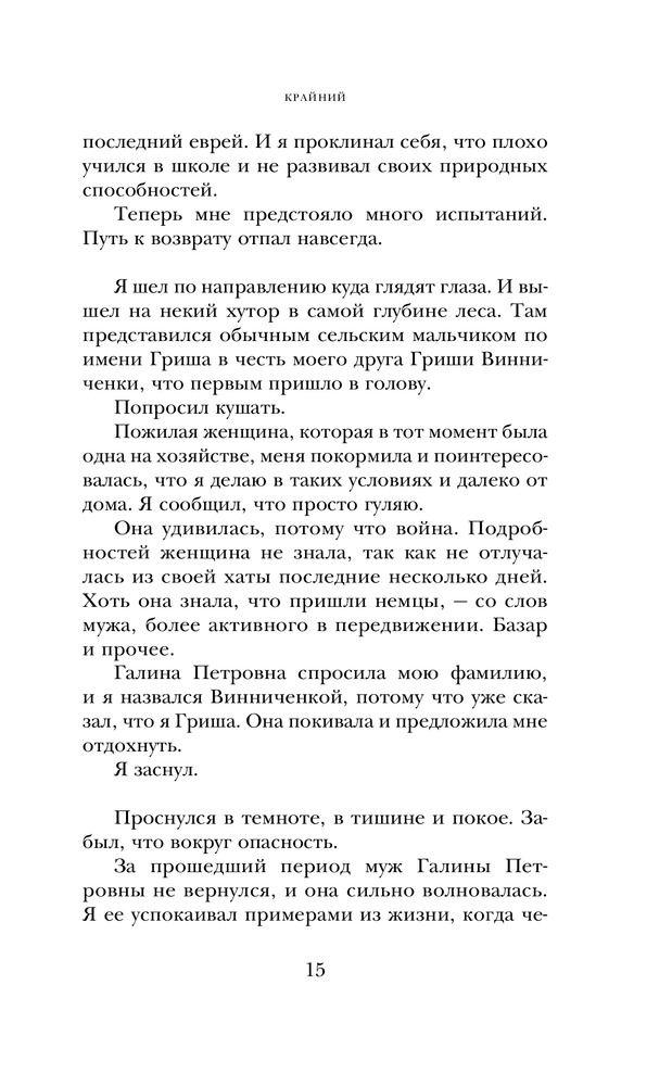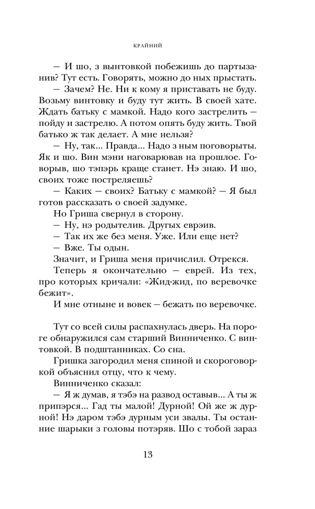 Главный герой романа «Крайний», постоянно находясь в центре событий, тем не менее всегда крайний. Он заложник обстоятельств — и на войне, и после войны. Судьба затягивает его в водоворот, из которого, казалось, не выбраться: еврейский партизанский отряд, «дело космополитов» и неутоляемая жажда любви и покоя.