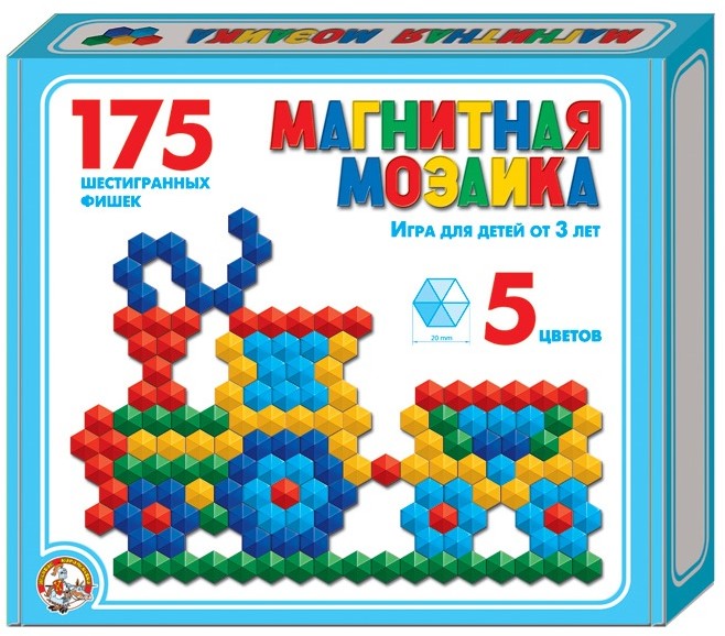 Мозаика магнитная шестигранная без игрового поля включает в себя 175 фишек, размером 20 мм и 5 цветов. |