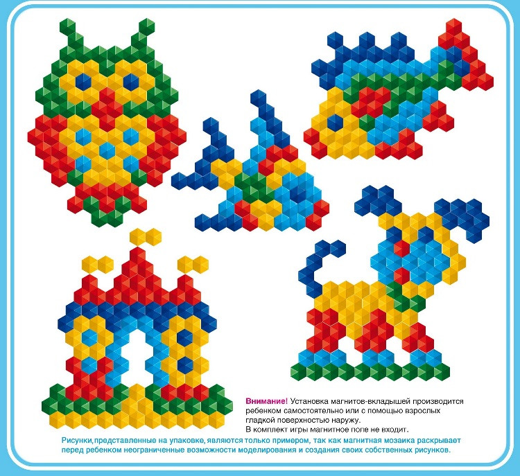Мозайка хорошая большая. Единственное надо магниты вставлять в саму мозаику и это занимает у взрослого примерно 30 мин. Доска у нас была своя. И примеров бы больше.