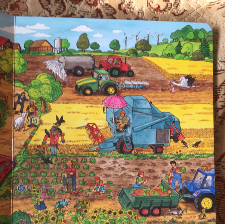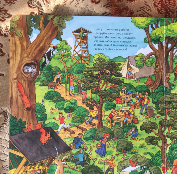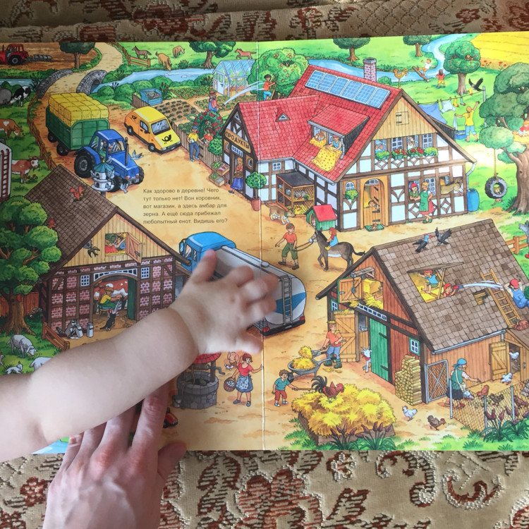 Первый раз покупаю книгу виммельбух, решила начать с этой. Книга очень красочная, яркая, листы очень плотные, гладкие, как-будто глянцевые. Формат большой, углы книги закруглённые. 14 страниц, 7 разворотов. Запах у страниц отсутствует. На каждом развороте маленький абзац текста как подсказка для истории. Дочери 1 год 5 месяцев, пока мало заинтересовала, в книге узнает только машины, играла минут 7) в первые 5 минут всё время гладила книгу и целовала обложку, потому что она гладкая)) на другом сайте читала очень много положительных отзывов об этом виммельбухе. Поэтому, если ребёнку не понравилось, может быть просто ещё рано (к слову дочь ещё не разговаривает). Подожду месяц, другой и снова предложу. Ещё учтите, просто для самостоятельного рассматривания книжка не подойдёт, родитель должен показывать и рассказывать историю по героев книги, тогда ребёнку точно понравится! Очень бюджетная книга по сравнению с виммельбухом от Бернер, где цена космос!)