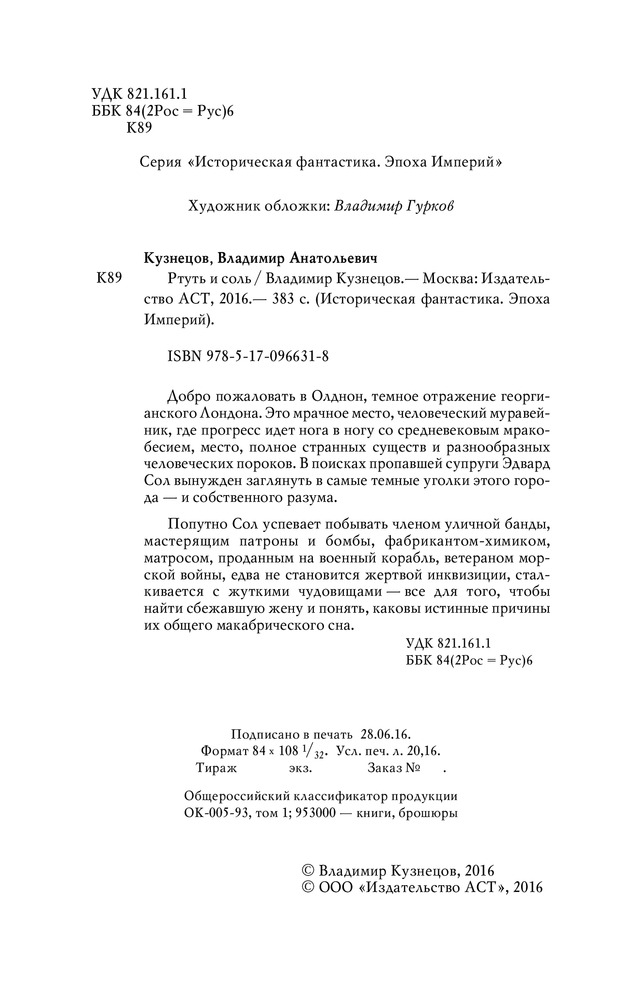 Ртуть и сольВ данный момент этот товар отсутствует в продаже. Возможно, у нас найдется аналогичный или похожий товар здесь. Серия: Историческая фантастика. Эпоха Империй Добро пожаловать в Олднон, темное отражение георгианского Лондона. Это мрачное место, человеческий муравейник, где прогресс идет нога в ногу со средневековым мракобесием, место, полное странных существ и разнообразных человеческих пороков. В поисках пропавшей супруги Эдвард Сол вынужден заглянуть в самые темные уголки этого города — и собственного разума. |