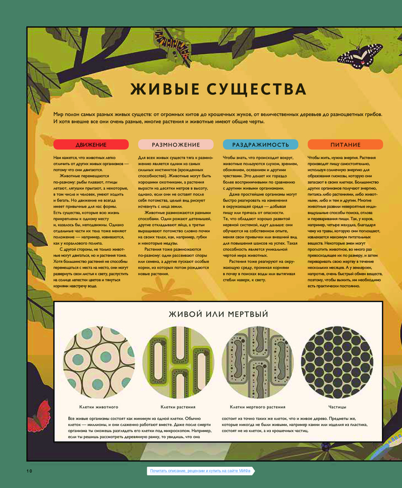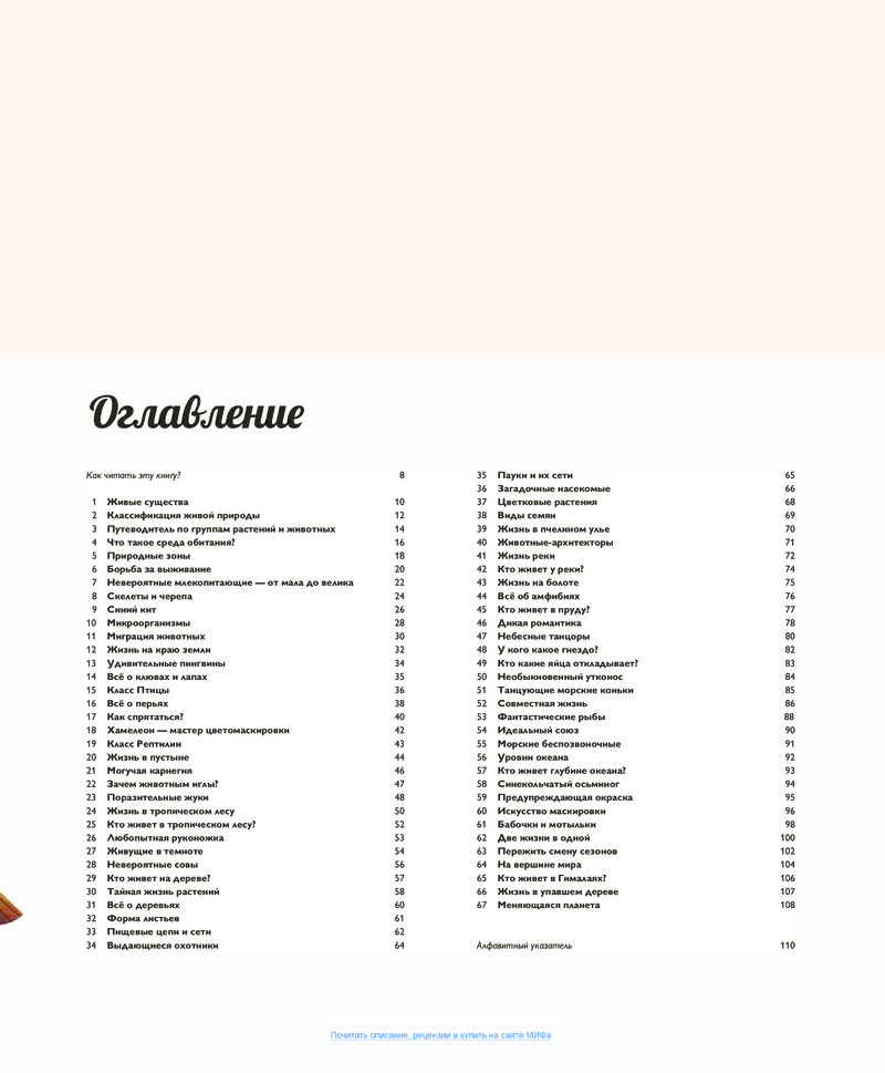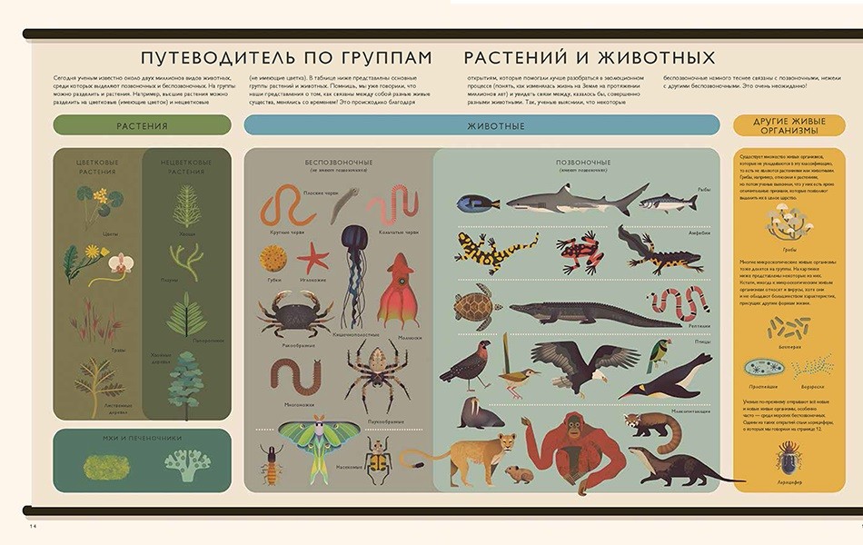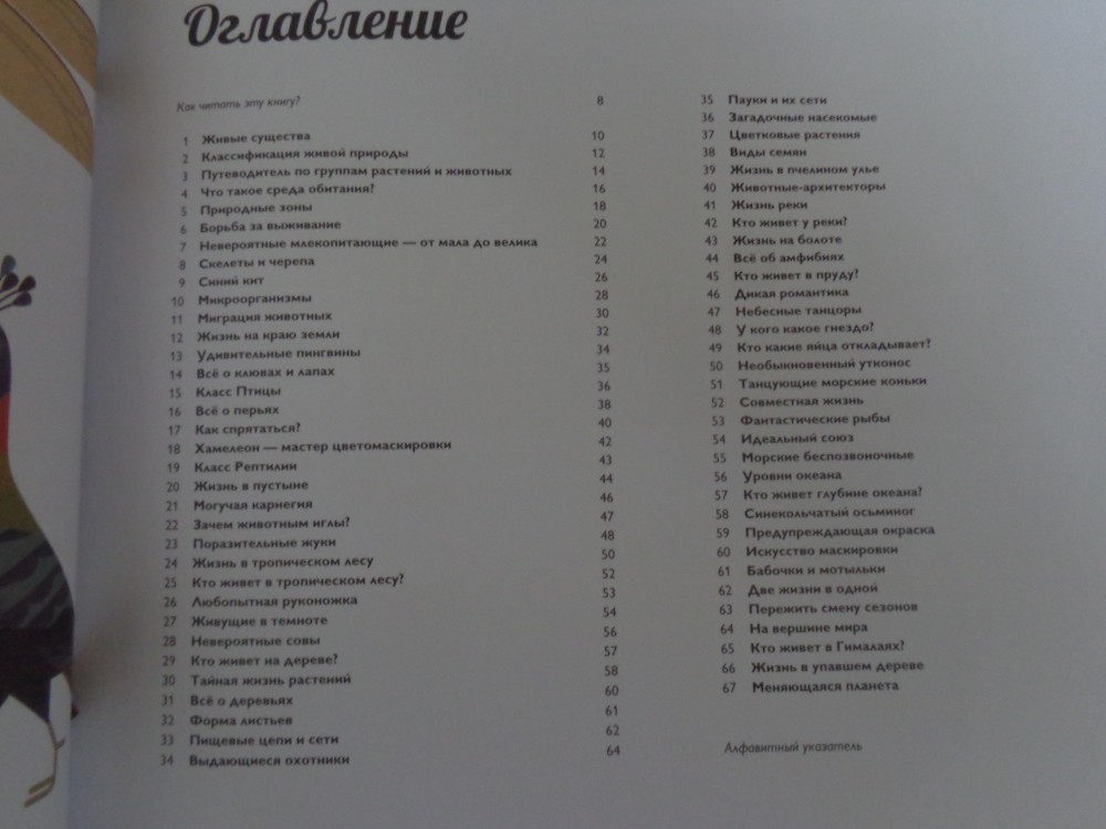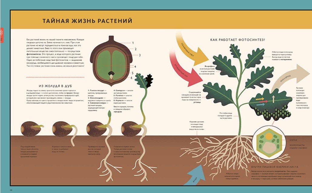 Помню, у меня была энциклопедия по биологии - серая, скучная, всё перемешивающая в голове в кашу((( А эта - яркая, позитивная, понятная и жутко интересная (пока мне, но надеюсь, что в школе она пригодится и сыну). Книга большого формата в матовой обложке с частичной лакировкой, страницы офсетные плотные. Мне невероятно понравились иллюстрации в одном стиле, они объединяют книгу. Честно признаться, что в большинстве энциклопедий на тему природы меня раздражает обилие ярких разношёрстных фотографий((( Эта книга очень познавательная, емкая по информативности, чего в ней только нет?! Полюбуйтесь сами.