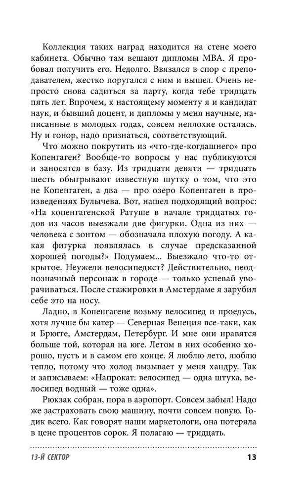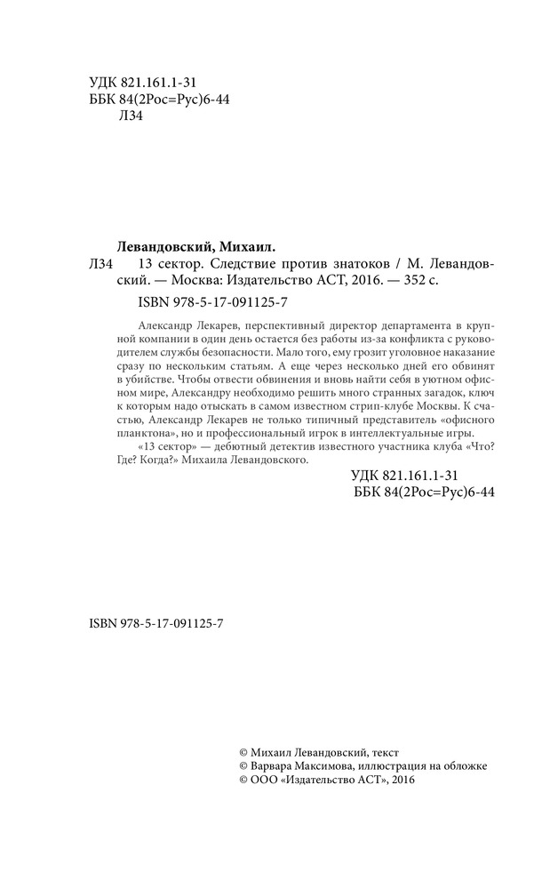 13 сектор. Следствие против знатоковВ данный момент этот товар отсутствует в продаже. Возможно, у нас найдется аналогичный или похожий товар здесь. Серия: Звезда СМИ Александр Лекарев, перспективный директор департамента в крупной компании в один день остается без работы из-за конфликта с руководителем службы безопасности. Мало того, ему грозит уголовное наказание сразу по нескольким статьям. А еще через несколько дней его обвинят в убийстве. Чтобы отвести обвинения и вновь найти себя в уютном офисном мире, Александру необходимо решить много странных загадок, ключ к которым надо отыскать в самом известном стрип-клубе Москвы. К счастью, Александр Лекарев не только типичный представитель «офисного планктона», но и профессиональный игрок в интеллектуальные игры. |