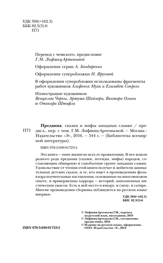 Кто знаком с советской 200 томной “Библиотекой всемирной литературы”, где в обязательном порядке были: обширные вступительная статья и примечания (комментарии), односторонние иллюстрации на вклейках и, конечно же, высокосортная бумага, делающая тома увесистыми и не подверженными старению; данная серия от изд-ва “Эксмо” станет для них разочарованием. Теперь о самой книге “Предания, сказки и мифы западных славян”. ОФОРМЛЕНИЕ: Наличие суперобложки; на корешке книги и переплетной крышке выполнено тиснение золотом; бумага газетная; 4 листа двусторонних иллюстраций (издатель и здесь решил сэкономить), выполненных на мелованной бумаге в виде вклеек. СОДЕРЖАНИЕ: Вступительная статья написана слабо. Примечаний к текстовой части нет (редколлегия посчитала, что в век Интернета они не нужны), хотя в сказаниях очень много топонимов и примечания были бы кстати, также встречаются непонятные слова. Сказки в переводе кандидата филологических наук Лифшиц-Артемьевой мне понравились, читаются легко. Много сказок данного сборника, похожих по содержанию, встречаются у братьев Гримм, Аксакова, Пушкина, Андерсена. Но самое главное, почему я приобрел данную книгу – “Букет” К. Я. Эрбена, который, увы, оказался не полным: из 13 преданий здесь только 9, но даже такому объему я рад, т.к. в настоящее время это редкость. Предания здесь представлены в поэтическом и прозаическом переводах. Есть примечания к “Букету” от самого автора, составителя и переводчика. Данный сборник рассчитан на взрослого читателя.