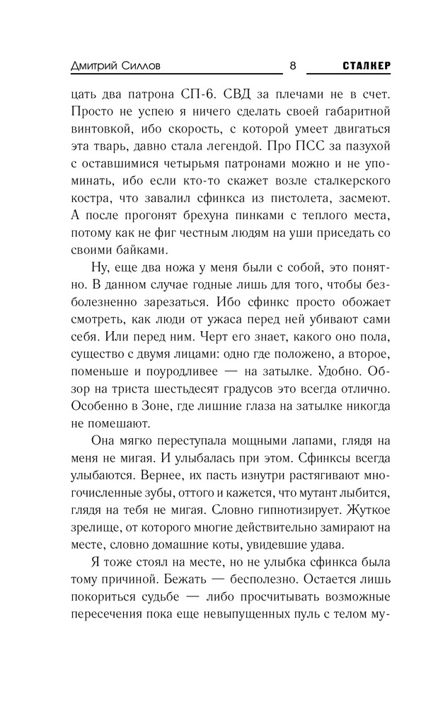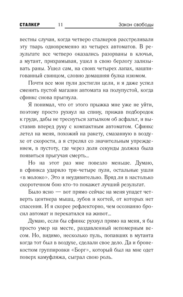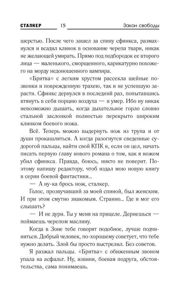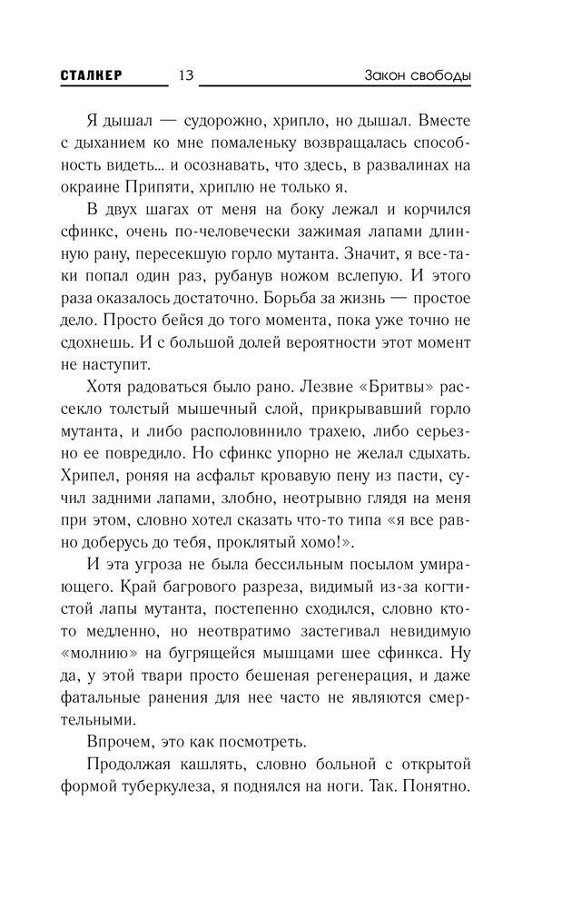 В данный момент этот товар отсутствует в продаже. Возможно, у нас найдется аналогичный или похожий товар здесь. Серия: Сталкер Когда сталкер в Зоне становится инвалидом, он свободен в своем выборе — уйти быстро и легко, пустив себе пулю в лоб, либо цепляться за жизнь из последних сил, умирая долго и мучительно. Снайперу не повезло. В бою он получил серьезное ранение. К тому же за его голову две самые мощные группировки Зоны назначили огромную награду. Есть ли смысл дальше бороться за жизнь? Не проще ли сделать правильный выбор, осознав полную безвыходность своего положения? Но закон свободы каждый трактует по-своему. Кто-то в критической ситуации убивает себя. А кто-то пытается убить тех, кто охотится на него. Пытается из последних сил, которых осталось совсем немного...