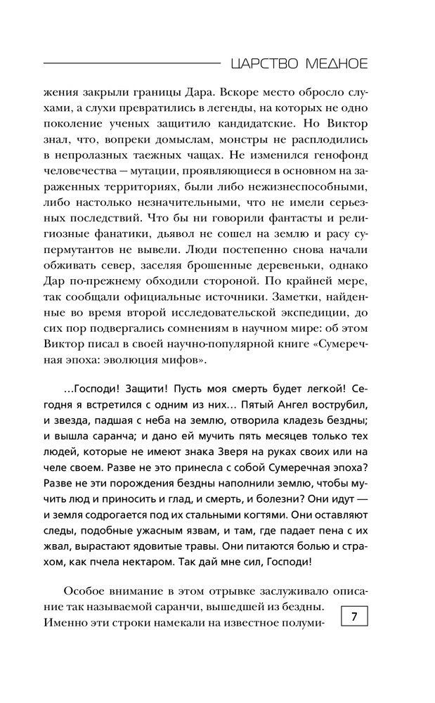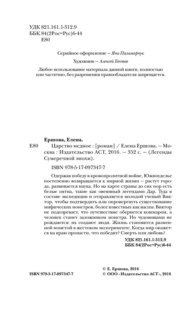 Царство медноеВ данный момент этот товар отсутствует в продаже. Возможно, у нас найдется аналогичный или похожий товар здесь. Серия: Легенды Сумеречной эпохи Одержав победу в кровопролитной войне, Южноуделье постепенно возвращается к мирной жизни — растут города, развивается наука. Но на карте страны до сих пор есть белые пятна, такие как овеянный легендами Дар. Туда в составе экспедиции и отправляется молодой ученый Виктор, чтобы подтвердить или опровергнуть существование мифических монстров, более известных, как васпы. Виктор не подозревает, что путешествие обернется кошмаром, а человек станет заложником монстра. Но чудовищами не рождаются: их создают люди. Жизнь становится разменной монетой в жестоком эксперименте. Когда мир окажется на краю пропасти, что победит? Смерть или любовь? |
