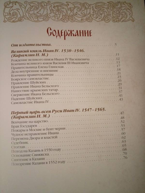 Издание очень высокого качества: обложка, бумага, иллюстрации, оформление страниц, шрифт - все на высшем уровне. Основная часть содержания - соответствующий раздел бессмертного и фундаментального труда Николая Михайловича Карамзина. Язык и стиль этого автора составляет золотой фонд русской словесности. Книга будет не только познавательна, но и доставит эстетической наслаждение.