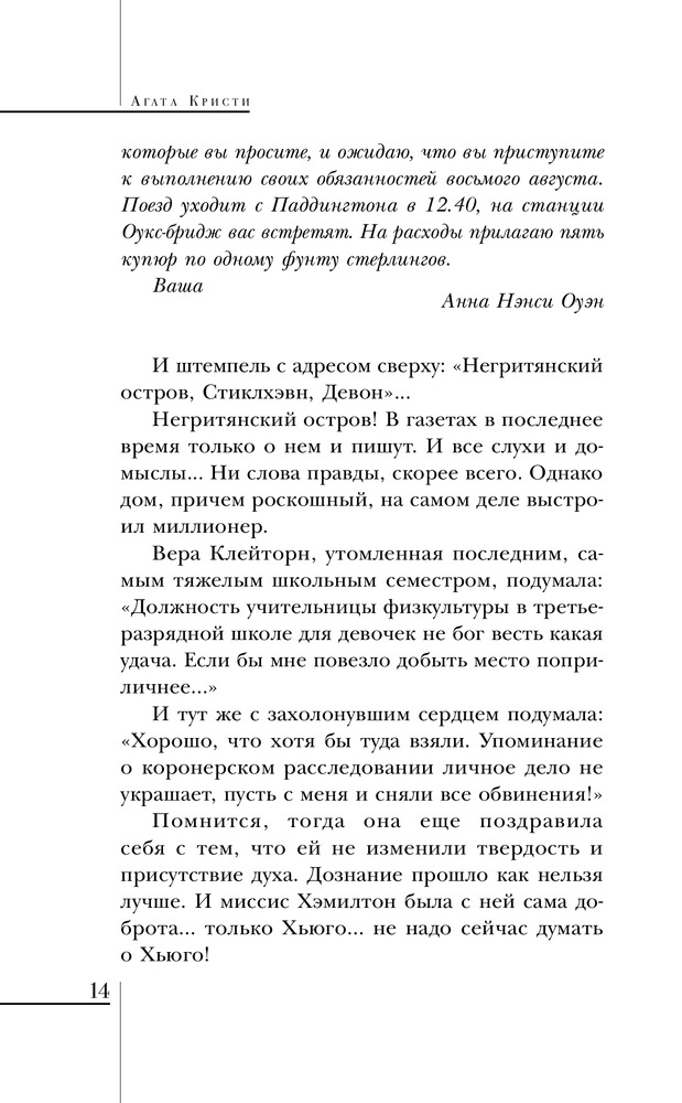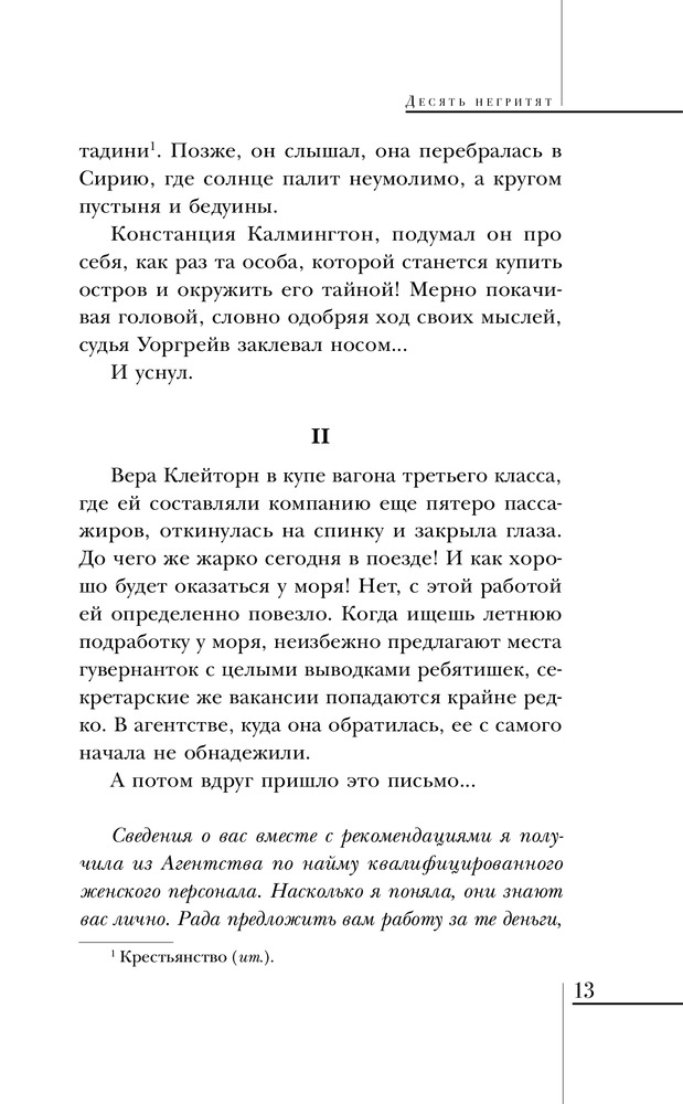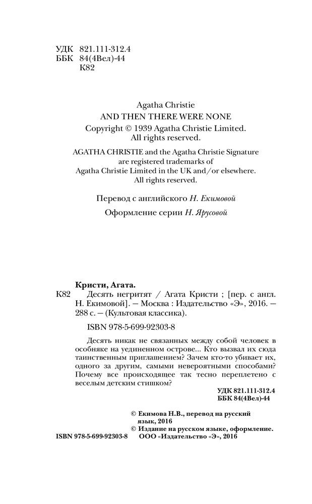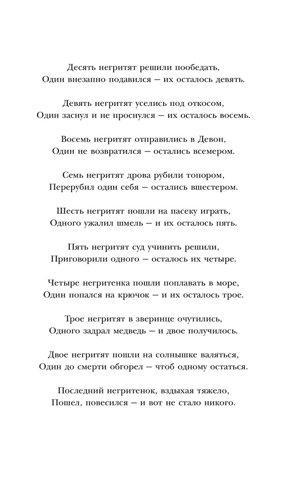 В данный момент этот товар отсутствует в продаже. Возможно, у нас найдется аналогичный или похожий товар здесь. Серия: Культовая классика Десять никак не связанных между собой людей в особняке на уединенном острове. Кто вызвал их сюда таинственным приглашением? Зачем кто-то убивает их, одного за другим, самыми невероятными способами? Почему все происходящее так тесно переплетено с веселым детским стишком?