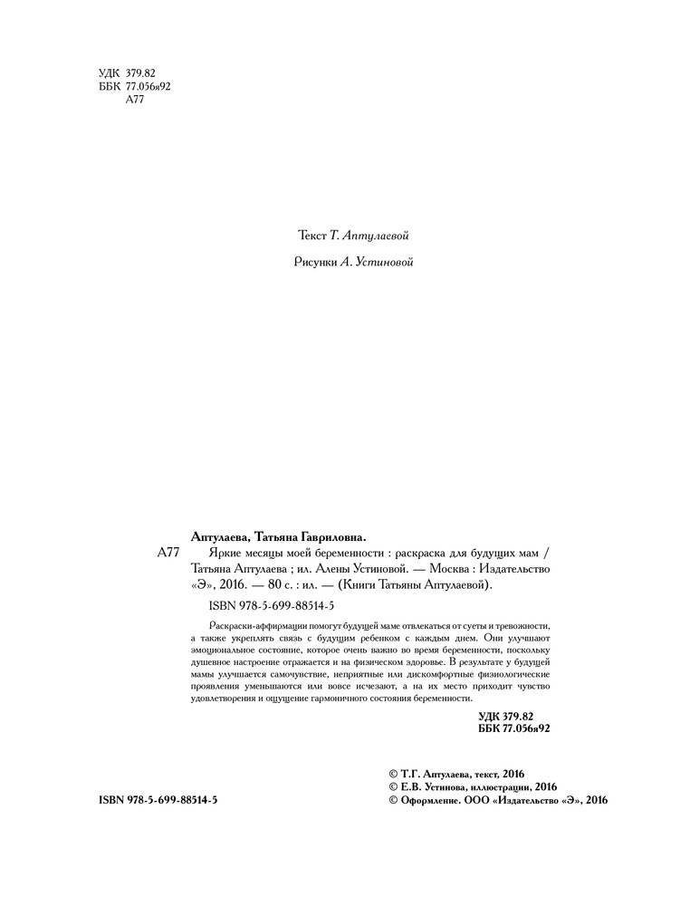 Яркие месяцы моей беременности. Раскраска для будущих мамЕлена Устинова, Татьяна Гавриловна Аптулаева В данный момент этот товар отсутствует в продаже. Возможно, у нас найдется аналогичный или похожий товар здесь. Серия: Книги Татьяны Аптулаевой Теперь появилась возможность создать уникальный альбом ожидания Вашего малыша своими руками! Для этого вам потребуется только раскраска и цветные карандаши! Сохраните ваши эмоции, чувства и переживания, раскрашивая и заполняя альбом! |