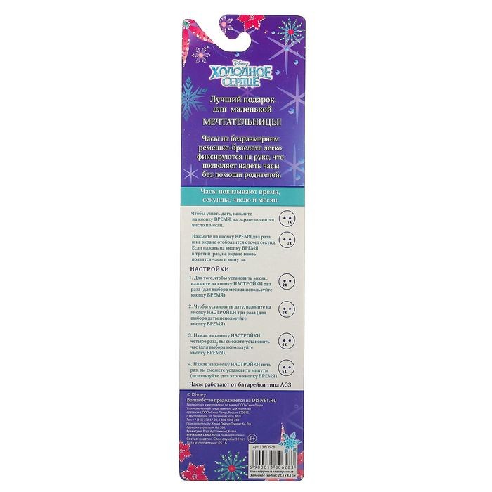 Disney Часы наручные электронные «Холодное сердце»В данный момент этот товар отсутствует в продаже. Возможно, у нас найдется аналогичный или похожий товар здесь. Серия: Холодное сердце Все дети хотят поскорее повзрослеть, иметь свою машину, мобильный телефон и, конечно же, наручные часы, как у мамы и папы. Подарите чаду часы наручные электронные «Холодное сердце», 22,5×4,5 см с изображением любимых героев Disney, и он будет прыгать от восторга! Все друзья будут завидовать такому красивому и функциональному аксессуару, а ребёнок научится следить за временем. Дети быстро растут, а благодаря безразмерному браслету-ремешку изделие долго будет в пору. Здесь нет мелких застёжек, поэтому малыш сможет надевать часы без помощи родителей. Часы из пластика не разобьются, если упадут. На экране отображается время, а также число и месяц. В устройство встроен секундомер. |