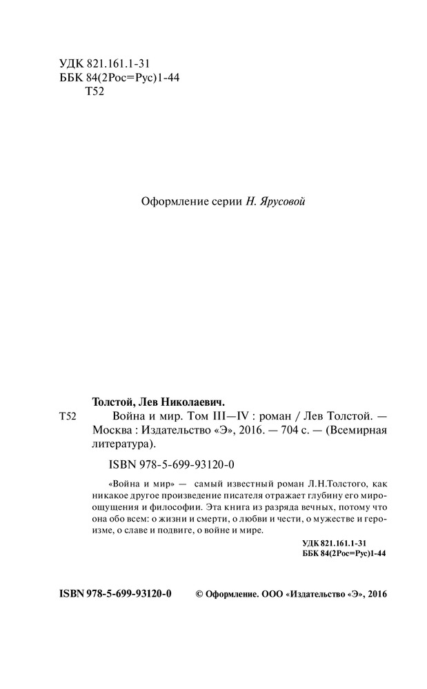 Серия: Всемирная литература «Война и мир» — самый известный роман Л.Н.Толстого, как никакое другое произведение писателя, отражает глубину его мироощущения и философии. Эта книга из разряда вечных, потому что она обо всем — о жизни и смерти, о любви и чести, о мужестве и героизме, о славе и подвиге, о войне и мире.  |