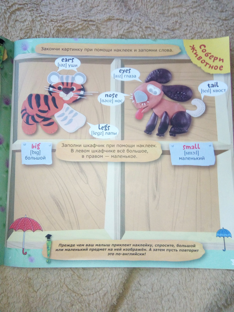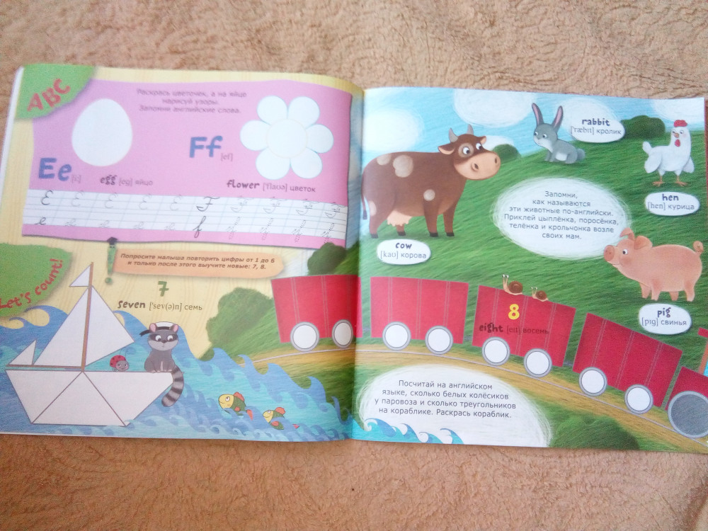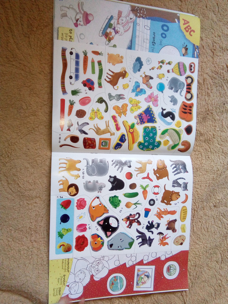 Эта самая лучшая книга по английскому, какая может быть для маленьких детей! Взяла дочке 4,5 лет. Книга яркая, красочная. Самое то, чтобы привить интерес к языку ребенка. Сама с удовольствием разглядываю картинки. Очень нравится. Единственный минус - наклейки бывает тяжеловато отсоединить от пленки.
