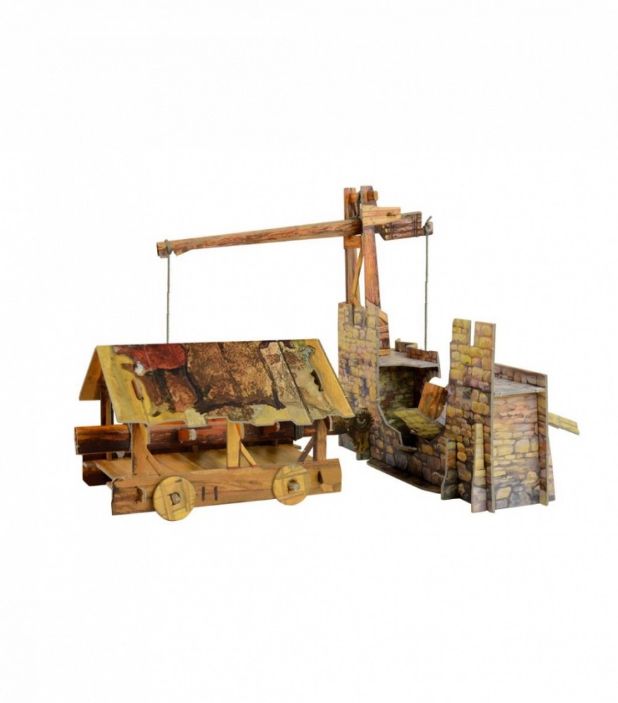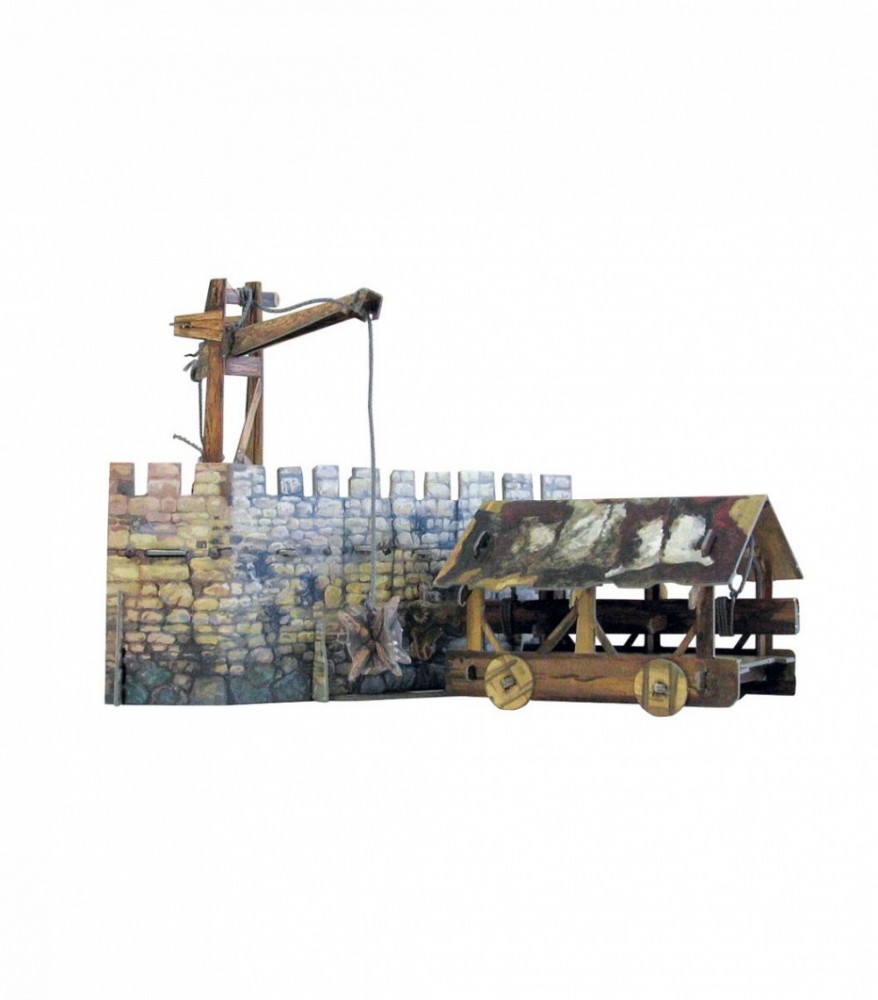 В данный момент этот товар отсутствует в продаже. Возможно, у нас найдется аналогичный или похожий товар здесь. Таран или баран - древнее стенобитное орудие в виде большого бревна, ударяющего одним концом в стену. Сначала бревно держали на руках, потом стали подвешивать к передвижной раме. Часто ударный конец бревна укреплялся бронзовым наконечником в форме бараньей головы. Для защиты от стрел и камней нападающие устраивали над тараном крышу, а чтобы деревянная конструкция не загорелась, крышу покрывали сырыми шкурами или дерном. Колеса вращаются, бревно раскачивается, часть городской стены может быть обрушена. В комплекте фигурки горожан и воинов.
