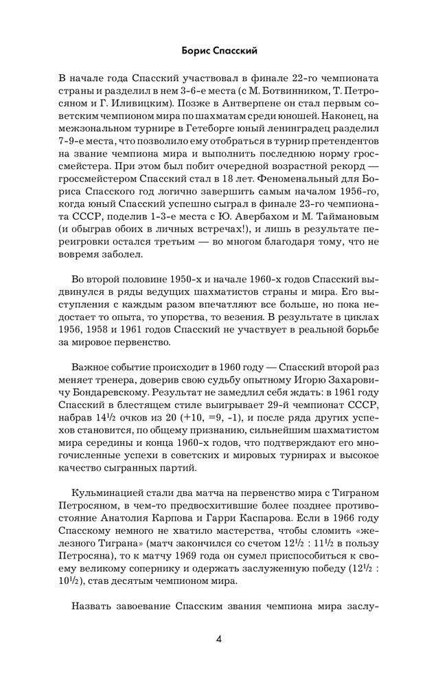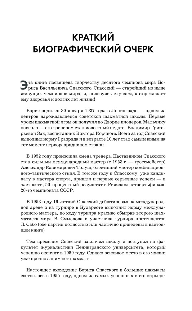Борис Спасский. Шахматные лекцииНиколай Михайлович Калиниченко В данный момент этот товар отсутствует в продаже. Возможно, у нас найдется аналогичный или похожий товар здесь. Серия: Шахматы. Классики Борис Спасский — российский шахматист, международный гроссмейстер, десятый чемпион мира по шахматам. В недалёком прошлом — сильнейший шахматист мира, кардинально отличающийся от своих коллег универсальным стилем игры. Он привык выигрывать. Просто и красиво. В книге «Школа шахмат Бориса Спасского» автор, Николай Калиниченко, собрал и систематизировал бесценный материал — лучшие образцы наследия Бориса Васильевича. Большое количество щедро проиллюстрированных примеров позволит относительно легко разобраться в хитрых стратегических схемах, освоить тактику «по Спасскому», научиться его тонкому позиционному пониманию. Книга украсит собой коллекции как начинающих шахматистов, так и профессионалов. |