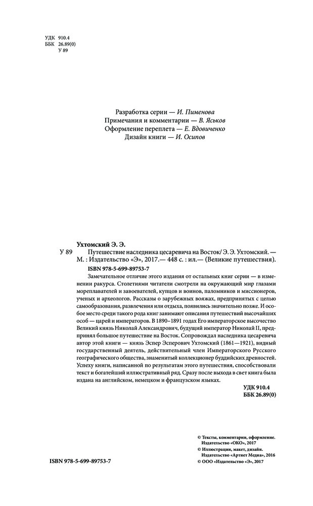 Путешествие на Восток наследника цесаревичаВ данный момент этот товар отсутствует в продаже. Возможно, у нас найдется аналогичный или похожий товар здесь. Серия: Подарочные издания. Великие путешествия Эспер Эсперович Ухтомский — государственный деятель Российской империи, князь из рода Рюриковичей. |