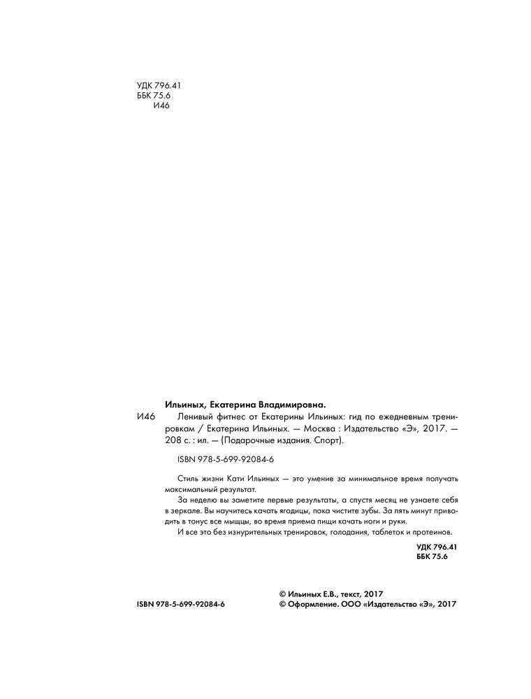 В данный момент этот товар отсутствует в продаже. Возможно, у нас найдется аналогичный или похожий товар здесь. Серия: Подарочные издания. Спорт Стиль жизни Кати Ильиных — это умение за минимальное время получать максимальный результат. За неделю вы заметите первые результаты, а спустя месяц не узнаете себя в зеркале. Вы научитесь качать ягодицы, пока чистите зубы. За пять минут приводить в тонус все мышцы, во время приема пищи качать ноги и руки. И все это без изнурительных тренировок, голодания , таблеток и протеинов. О чем эта книга: