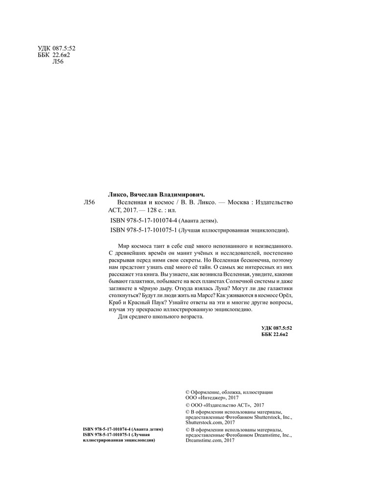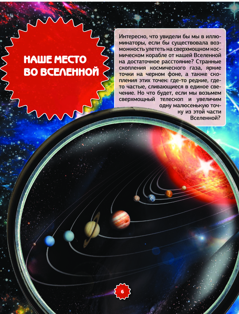 Серия: Большой иллюстрированный 4D гид для детей На протяжении тысячелетий люди изобретали сложнейшие приборы, чтобы приблизиться к звездам, составляли карты, проектировали космические корабли, выходили в открытое космическое пространство. У тебя в руках современное издание обо всем, что так манит своей неизвестностью, — бесконечном космическом пространстве, планетах нашей Солнечной системы и их спутниках, космических кораблях, телескопах, кометах, астероидах и многом другом. Эта книга не только расскажет тебе о самом важном и интересном во Вселенной, но и покажет — некоторые иллюстрации «оживут» в твоих руках. Используй бесплатное приложение для 4D-визуализации и наслаждайся увлекательным путешествием в бескрайнее космическое пространство. |