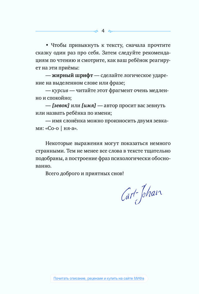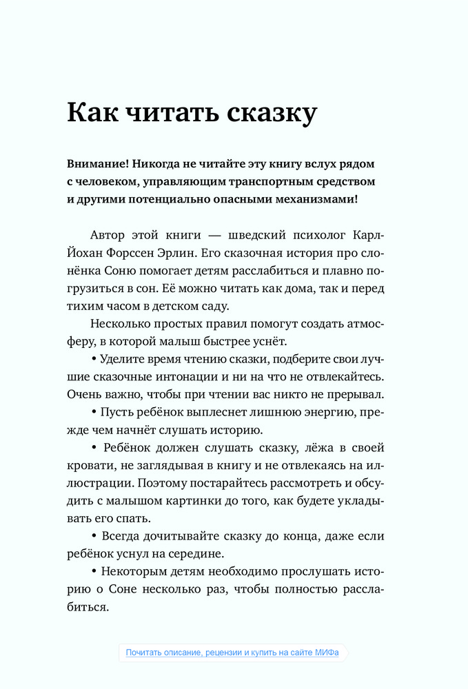 Книга красивая, хорошо сделана. Картинки милые и добрые. Дочке понравилось. На счет чудодейственного засыпания не знаю, не помогло. Вроде все по методике делала. Хотя пока читала сама чуть не уснула, зевать постоянно надо. Но все равно 5, приятное чтение на ночь!