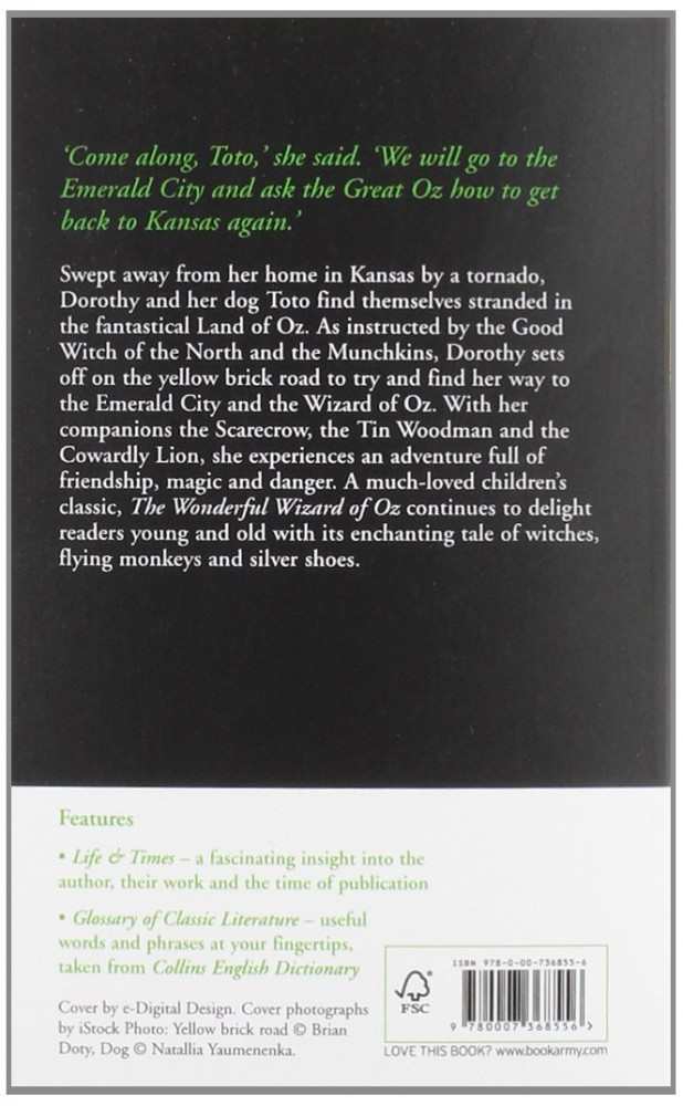 The Wonderful Wizard of OzВ данный момент этот товар отсутствует в продаже. Возможно, у нас найдется аналогичный или похожий товар здесь. Серия: Collins Classics HarperCollins is proud to present its new range of best-loved, essential classics. ’ Come along, Toto, she said. We will go to the Emerald City and ask the Great Oz how to get back to Kansas again. ’ Swept away from her home in Kansas by a tornado, Dorothy and her dog Toto find themselves stranded in the fantastical Land of Oz. As instructed by the Good Witch of the North and the Munchkins, Dorothy sets off on the yellow brick road to try and find her way to the Emerald City and the Wizard of Oz, who can help her get home. With her companions the Scarecrow, the Tin Woodman and the Cowardly Lion, Dorothy experiences an adventure full of friendship, magic and danger. A much-loved children’s classic, The Wizard of Oz continues to delight readers young and old with its enchanting tale of witches, flying monkeys and silver shoes. |