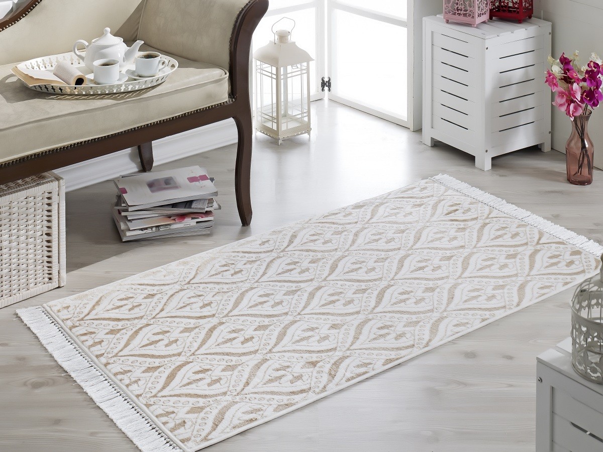 Коврик приятный на ощупь. Цвет не золотистый, а ближе к бежевому. Размер 150 х 80 см без бахромы. С бахромой 180 х 80 см. Не знаю как будет после стирки. Надеюсь, всё будет хорошо. Спасибо