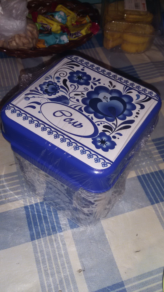 Хорошая емкость, вместительная. Килограммовая пачка соли помещается. Внешний вид, конечно изумительный. Обожаю гжель. Внутри есть ложечка, которая должна крепиться к верхней крышке, но не крепится. Крышка закрывается неплотно, очень свободно. С креплением нужно обращаться бережно.