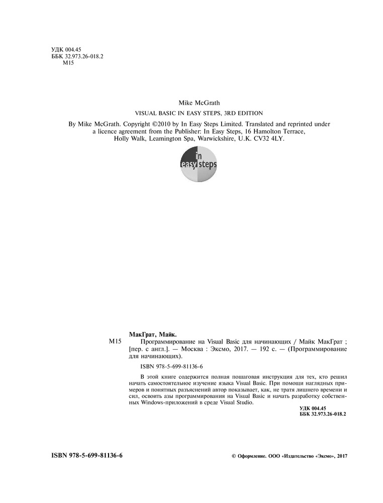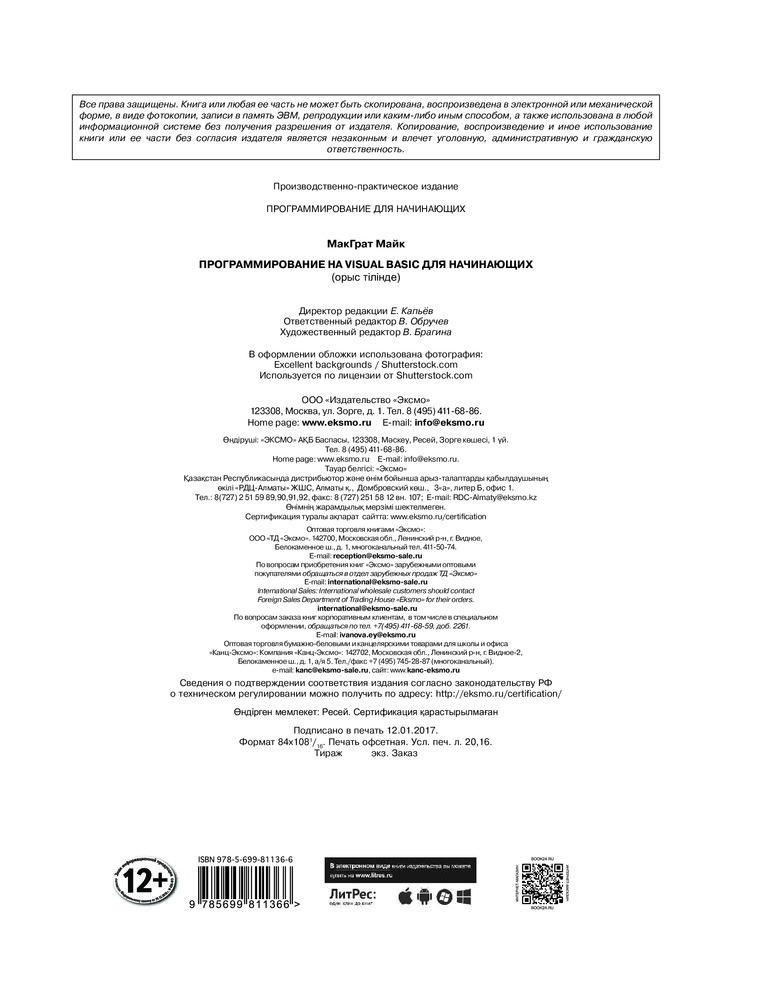 💳 Оплатить за товар можно при получении 🇰🇿 Есть бесплатная доставка по Казахстану 🎁 Копите бонусы с каждой покупки Серия: Программирование для начинающих (обложка) В этой книге содержится полная пошаговая инструкция для тех, кто решил начать самостоятельное изучение языка Visual Basic. При помощи наглядных примеров и понятных разъяснений автор показывает, как, не тратя лишнего времени и сил, освоить азы программирования на Vusial Basic и начать разработку собственных Windows-приложений в среде Vusial Studio. |