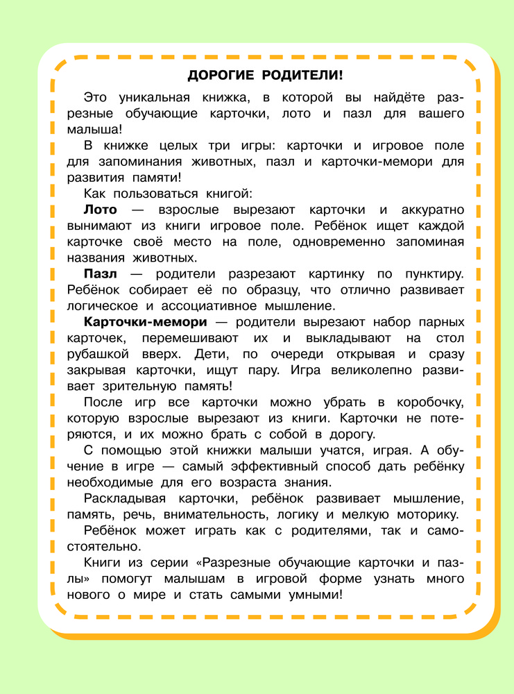 ЖивотныеВ данный момент этот товар отсутствует в продаже. Возможно, у нас найдется аналогичный или похожий товар здесь. Серия: Разрезные обучающие карточки и пазлы Как показать малышам животных? Можно сводить их в зоопарк, а можно поиграть с ними в разрезные обучающие карточки, которые помогут маленьким деткам быстро и весело выучить названия животных и узнать, как они выглядят. В этой большой цветной книжке целых три развивающих игры — лото «Животные», пазл и карточки-мемори. Раскладывая карточки с фотографиями животных, ребёнок запоминает их названия, развивает мышление, память, речь и мелкую моторику. Книги из серии «Разрезные обучающие карточки и пазлы» помогут малышам стать самыми умными и сообразительными! |