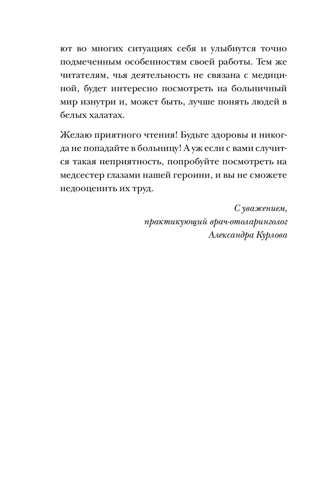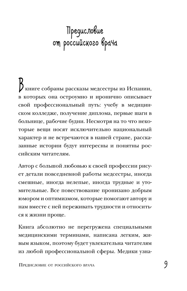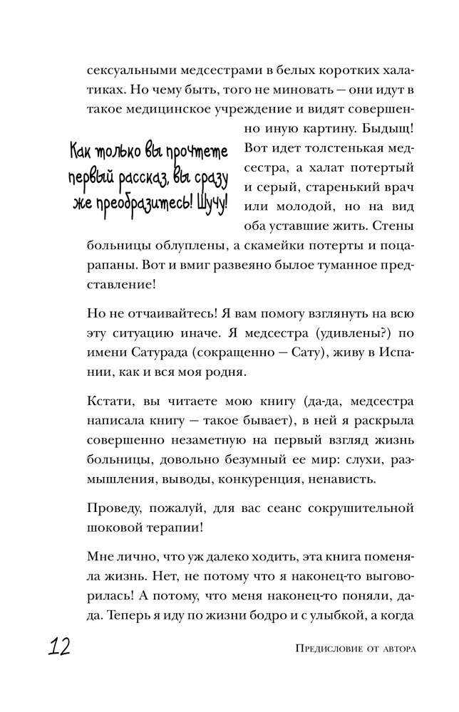 Отзывы на эту книгу были диаметрально противоположные, решила рискнуть, купила и УЖАСНО РАЗОЧАРОВАЛАСЬ. Обещанный юмор - натянутый, смешно только местами и это бородатые байки. Если вы хотя бы раз лежали в больнице или проходили обследование, то о работе медсестры ничего нового не узнаете. Также покоробило отношение к собственной работе. Книга снабжена примечаниями от российской медсестры, а вторая книга предисловием аж от целого испанского стенд-аппера.
