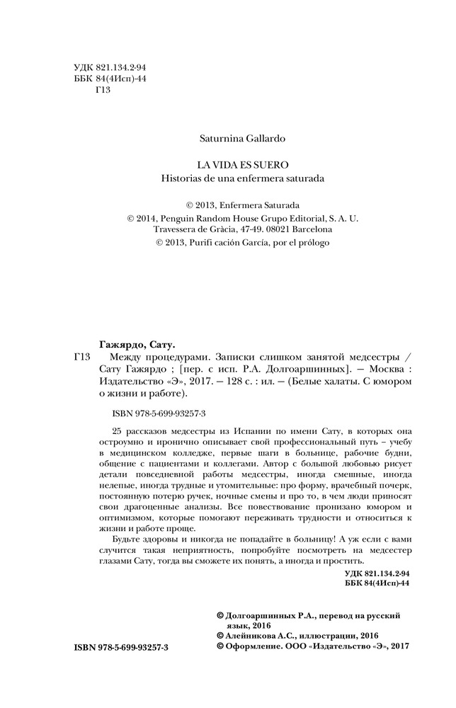 Между процедурами. Записки слишком занятой медсестрыВ данный момент этот товар отсутствует в продаже. Возможно, у нас найдется аналогичный или похожий товар здесь. 25 рассказов медсестры из Испании по имени Сату, в которых она остроумно и иронично описывает свой профессиональный путь — учебу в медицинском колледже, первые шаги в больнице, рабочие будни, общение с пациентами и коллегами. Автор с большой любовью рисует детали повседневной работы медсестры, иногда смешные, иногда нелепые, иногда трудные и утомительные: про форму, врачебный почерк, постоянную потерю ручек, ночные смены и про то, в чем люди приносят свои драгоценные анализы. Все повествование пронизано юмором и оптимизмом, которые помогают переживать трудности и относиться к жизни и работе проще. Будьте здоровы и никогда не попадайте в больницу! А уж если с вами случится такая неприятность, попробуйте посмотреть на медсестер глазами Сату, тогда вы сможете их понять, а иногда и простить. |