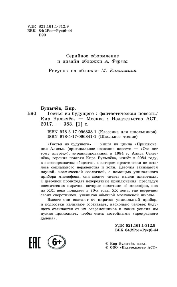 Гостья из будущегоВ данный момент этот товар отсутствует в продаже. Возможно, у нас найдется аналогичный или похожий товар здесь. Серия: Школьное чтение «Гостья из будущего» — книга из цикла «Приключения Алисы» (оригинальное название повести — «Сто лет тому вперед»), экранизированная в 1984 г. Алиса Селезнева, героиня повести Кира Булычева, живет в XXI веке, в высокоразвитом обществе, в котором практически не осталось социального неравенства, войн, моральных и физических болезней. Девочка занимается наукой, космической зоологией, а потому попадает в самые неожиданные переделки, в том числе гоняется за космическими пиратами и благодаря этому оказывается в 70-х годах ХХ века, где встречает своих сверстников, учеников обычной московской школы. Вместе они спасают от пиратов уникальный прибор, и подростки начинают осознавать, насколько человек будущего отличается от их современников и какие усилия им нужно приложить, чтобы стать достойными «прекрасного далёка». |