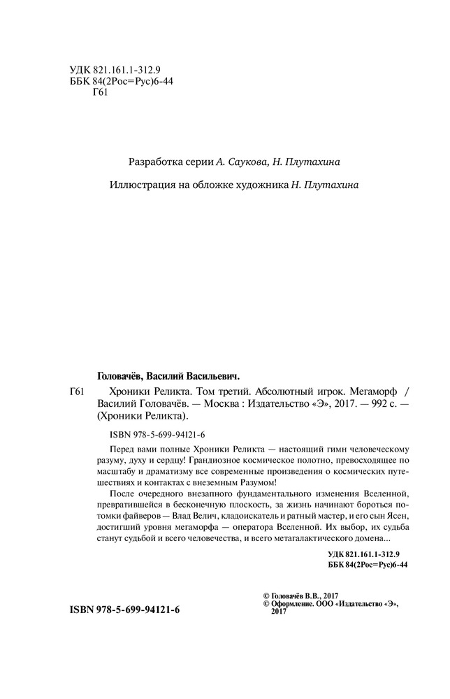 Хроники Реликта. Том третий. Абсолютный игрок. МегаморфВ данный момент этот товар отсутствует в продаже. Возможно, у нас найдется аналогичный или похожий товар здесь. Серия: Хроники Реликта Перед вами полные Хроники Реликта — настоящий гимн человеческому разуму, духу и сердцу! Грандиозное космическое полотно, превосходящее по масштабу и драматизму все современные произведения о космических путешествиях и контактах с внеземным Разумом! |