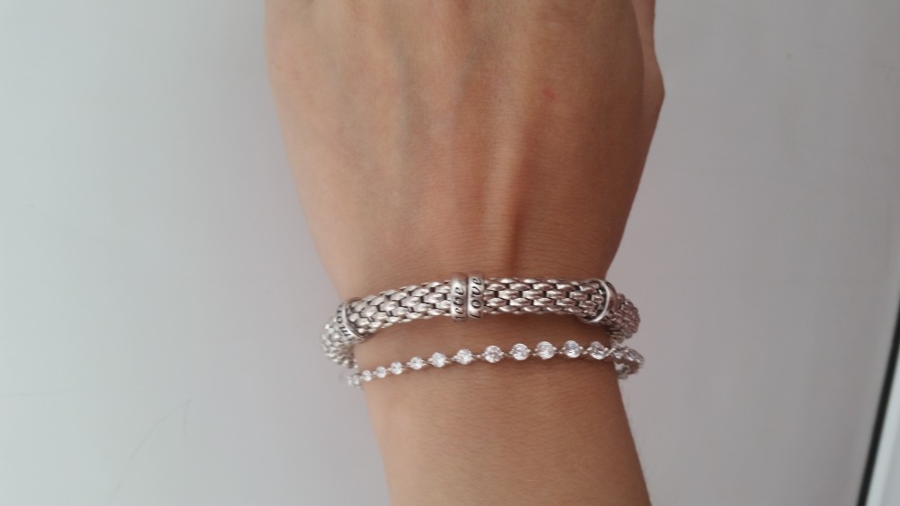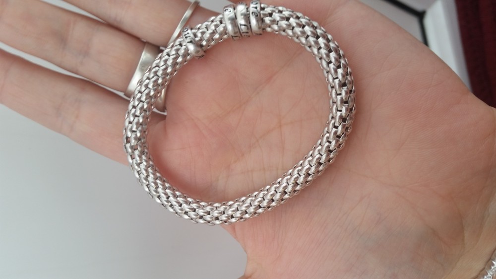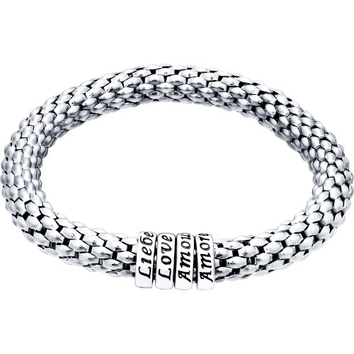 Широкий серебряный браслет подчеркнёт хрупкое женское запястье. Украшение можно носить индивидуально, сочетать с часами или другими браслетами. Подвески со словом «Любовь», написанным на четырёх языках, придают изделию романтический характер, благодаря чему оно может стать оригинальным признанием в чувствах.
