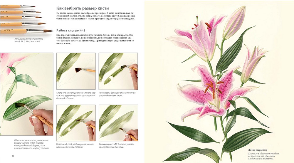 Вдохновляющая книга, она просто чудесна! Очень много иллюстраций цветов нарисованных акварелью, очень много поэтапных рисунков цветов, лепестков и листьев. Представлено много техник рисования акварелью. Книга очень понравилась.