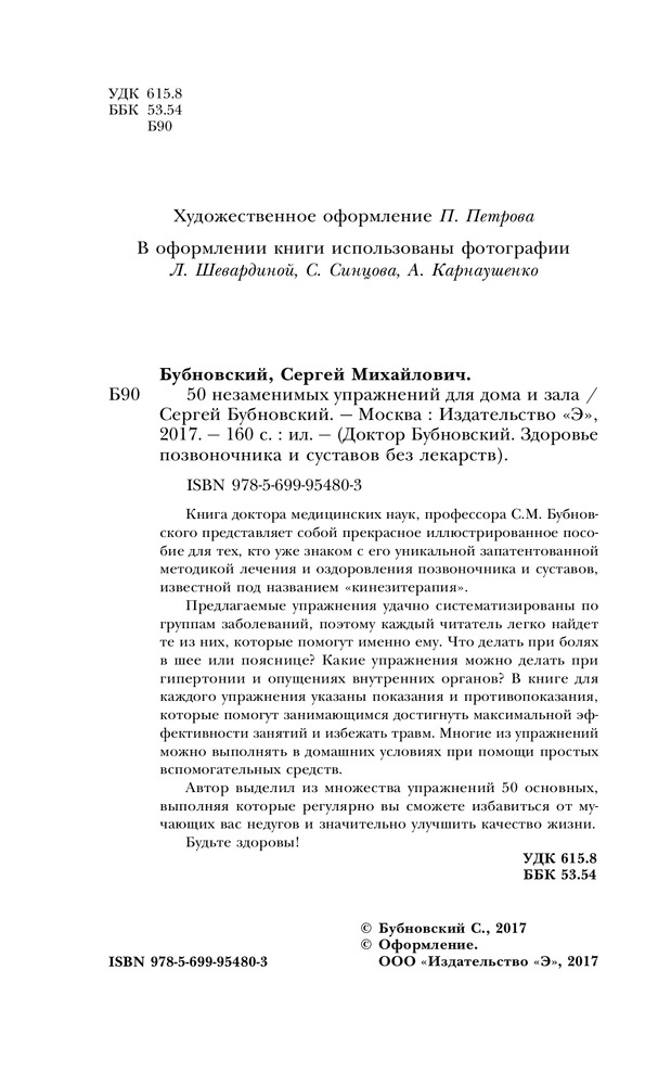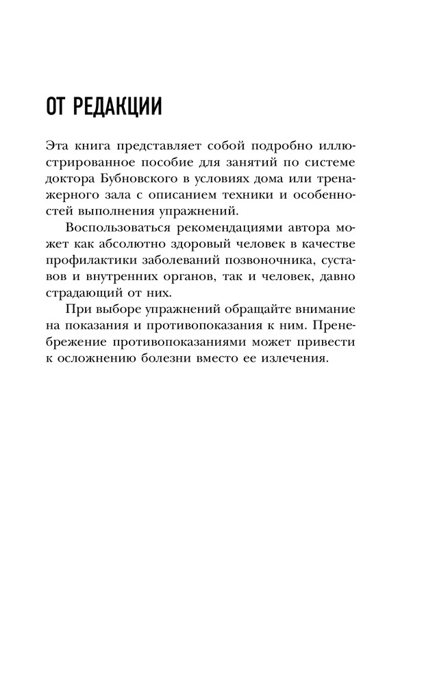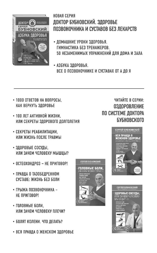 В данный момент этот товар отсутствует в продаже. Возможно, у нас найдется аналогичный или похожий товар здесь. Серия: Доктор Бубновский. Здоровье позвоночника и суставов без лекарств Книга доктора медицинских наук, профессора С.М. Бубновского представляет собой прекрасное иллюстрированное пособие для тех, кто уже знаком с его уникальной запатентованной методикой лечения и оздоровления позвоночника и суставов, известной под названием «кинезитерапия».