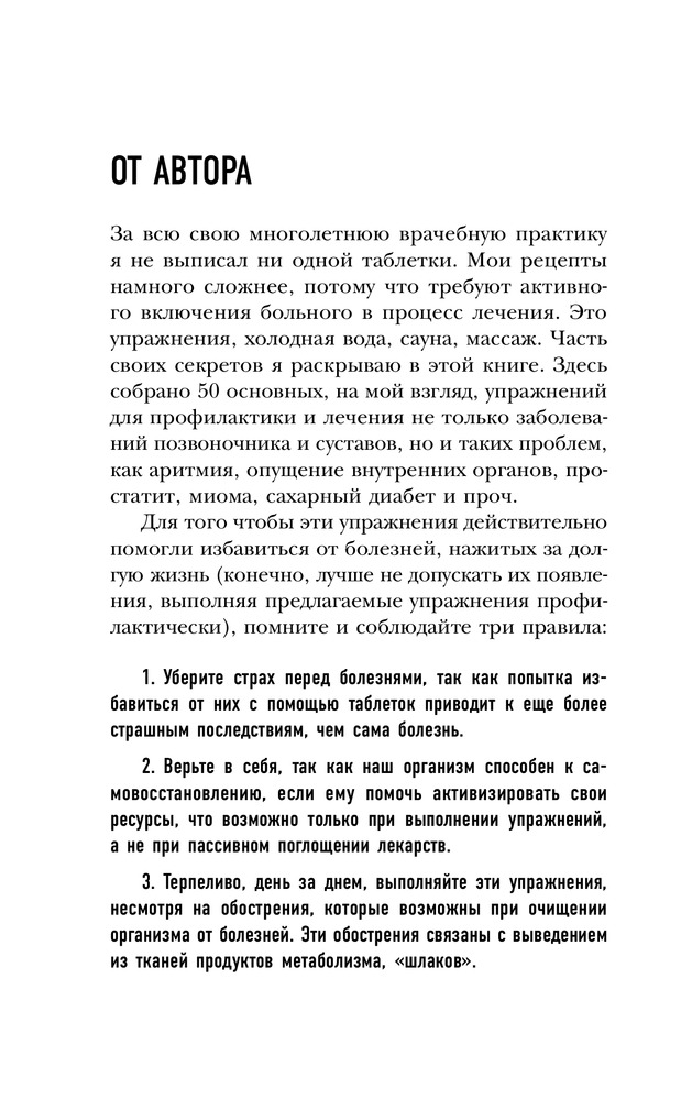 Автор выделил из множества упражнений 50 основных, выполняя которые регулярно вы сможете избавиться от мучающих вас недугов и значительно улучшить качество жизни.