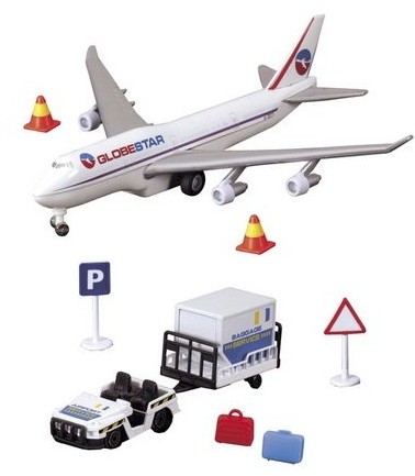 Комплект: самолет, машинка с прицепом, дорожные знаки, чемоданы.