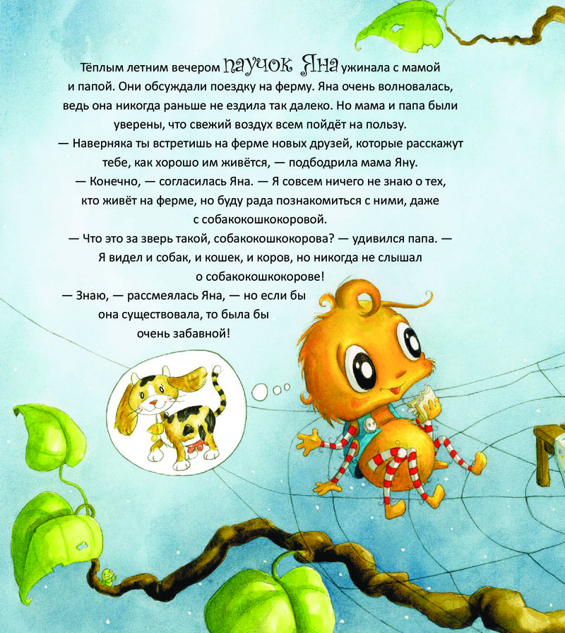 Паучок Яна. Каникулы на фермеВ данный момент этот товар отсутствует в продаже. Возможно, у нас найдется аналогичный или похожий товар здесь. Серия: Вы и ваш ребенок Маленький симпатичный паучок по имени Яна отправляется на каникулы на ферму! Конечно, там живут многие ее родственники-пауки, и мама с папой будут рядом, но все же кто знает, какие встречи и приключения ее ожидают? Давайте вместе с Яной познакомимся с животными, которые живут на ферме, и из первых уст узнаем, чем они там занимаются. |