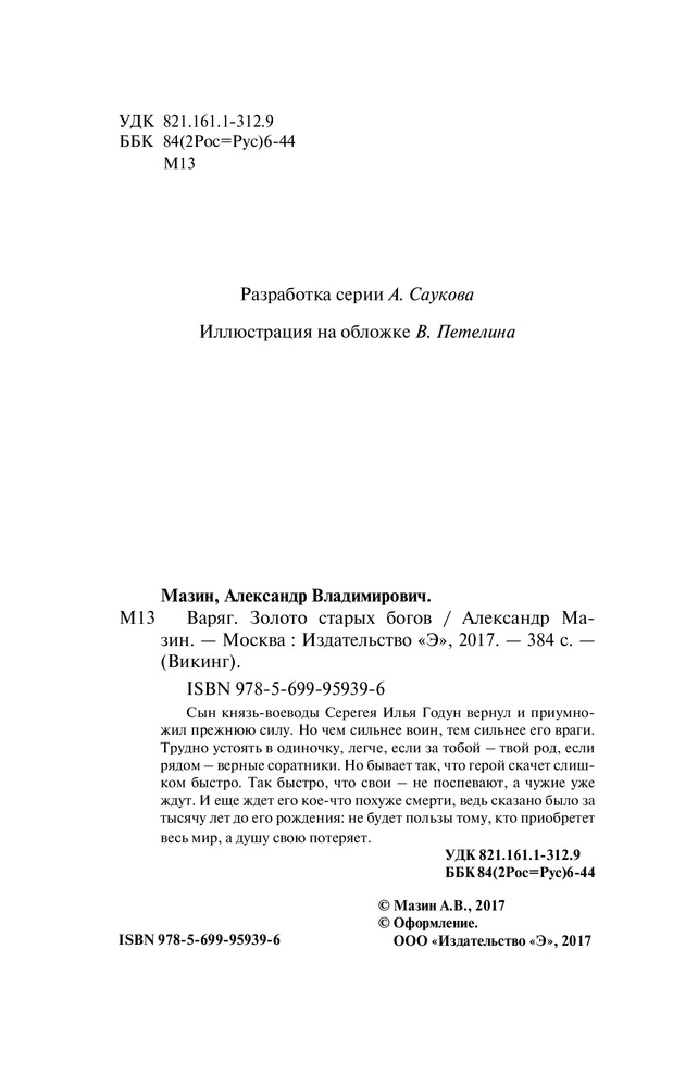 В данный момент этот товар отсутствует в продаже. Возможно, у нас найдется аналогичный или похожий товар здесь. Серия: Викинг. Фантастика Александра Мазина Сын князь-воеводы Серегея Илья Годун вернул и приумножил прежнюю силу. Но чем сильнее воин, тем сильнее его враги. Трудно устоять в одиночку, легче, если за тобой — твой род, если рядом — верные соратники. Но бывает так, что герой скачет слишком быстро. Так быстро, что свои — не поспевают, а чужие уже ждут. И еще ждет его кое-что похуже смерти, ведь сказано было за тысячу лет до его рождения: не будет пользы тому, кто приобретет весь мир, а душу свою потеряет.