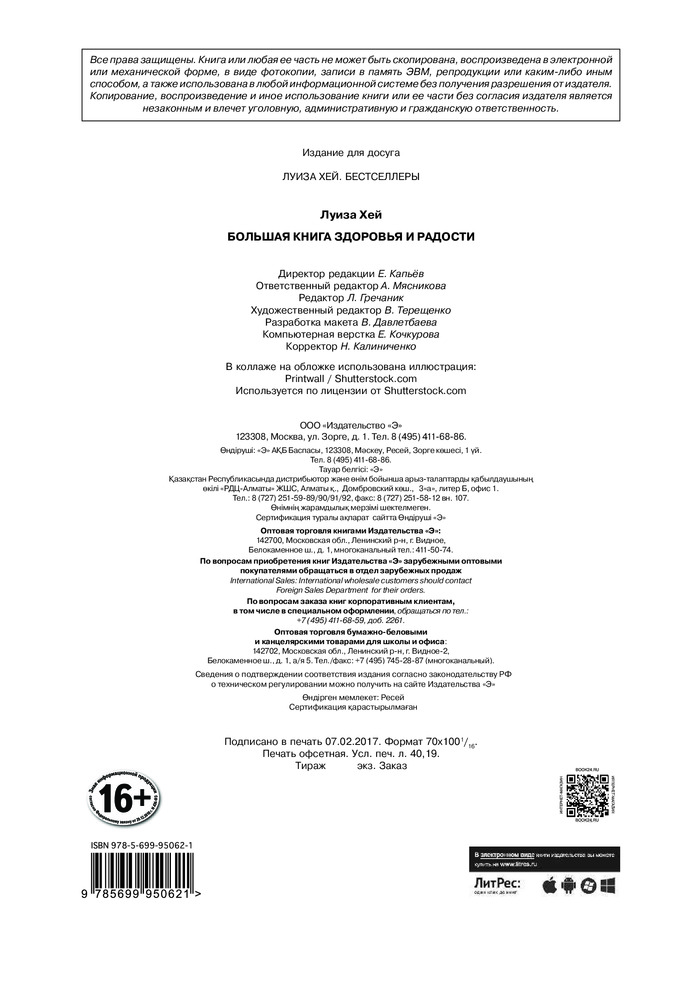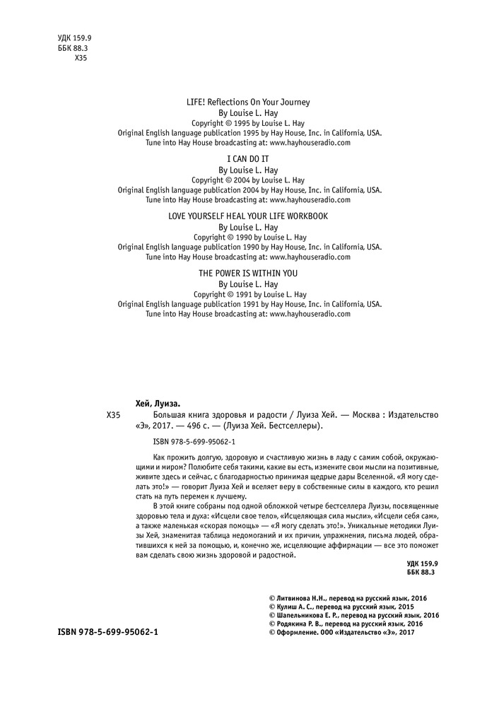 Большая книга здоровья и радостиВ данный момент этот товар отсутствует в продаже. Возможно, у нас найдется аналогичный или похожий товар здесь. Серия: Луиза Хей. Бестселлеры Как прожить долгую, здоровую и счастливую жизнь в ладу с самим собой, окружающими и миром? Полюбите себя такими, какие вы есть, измените свои мысли на позитивные, живите здесь и сейчас, с благодарностью принимая щедрые дары Вселенной. «Я могу сделать это!» — говорит Луиза Хей и вселяет веру в собственные силы в каждого, кто решил стать на путь перемен к лучшему. |