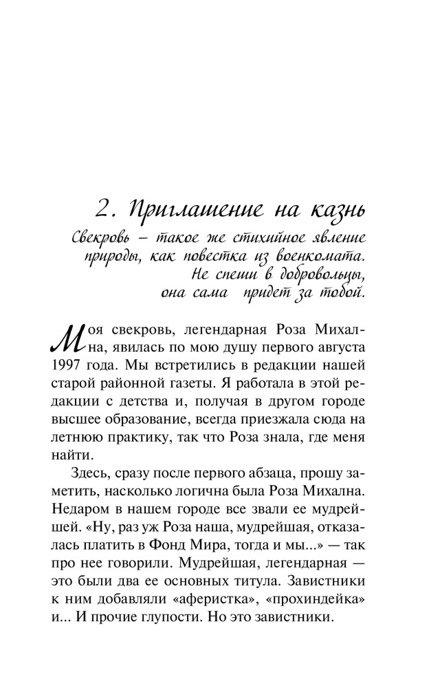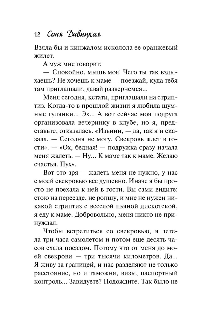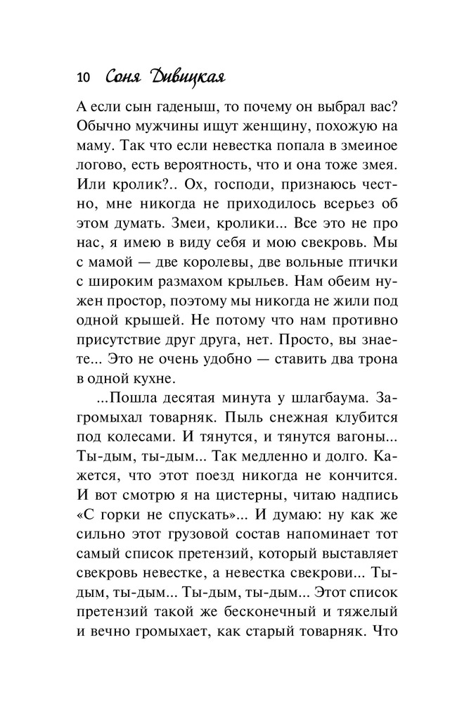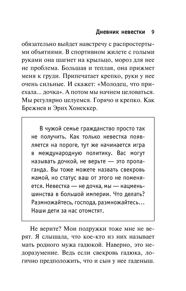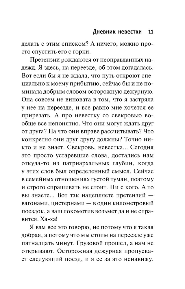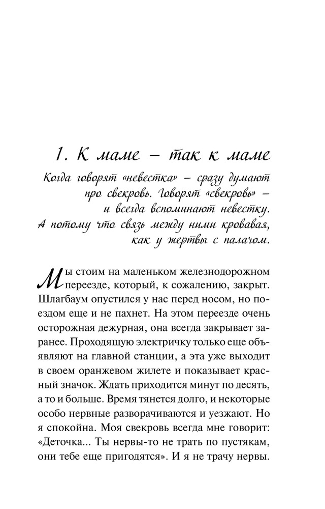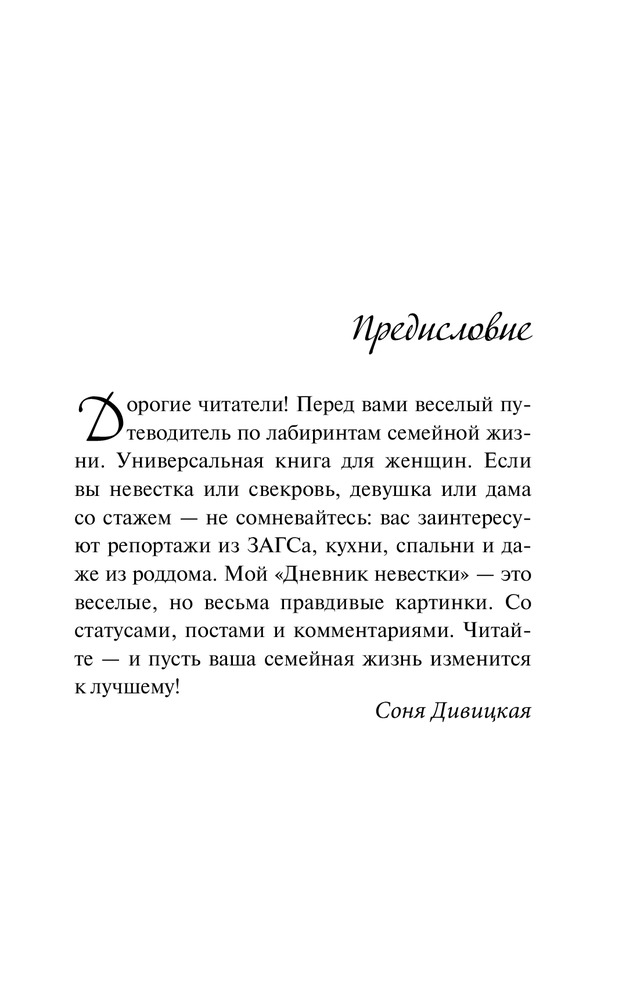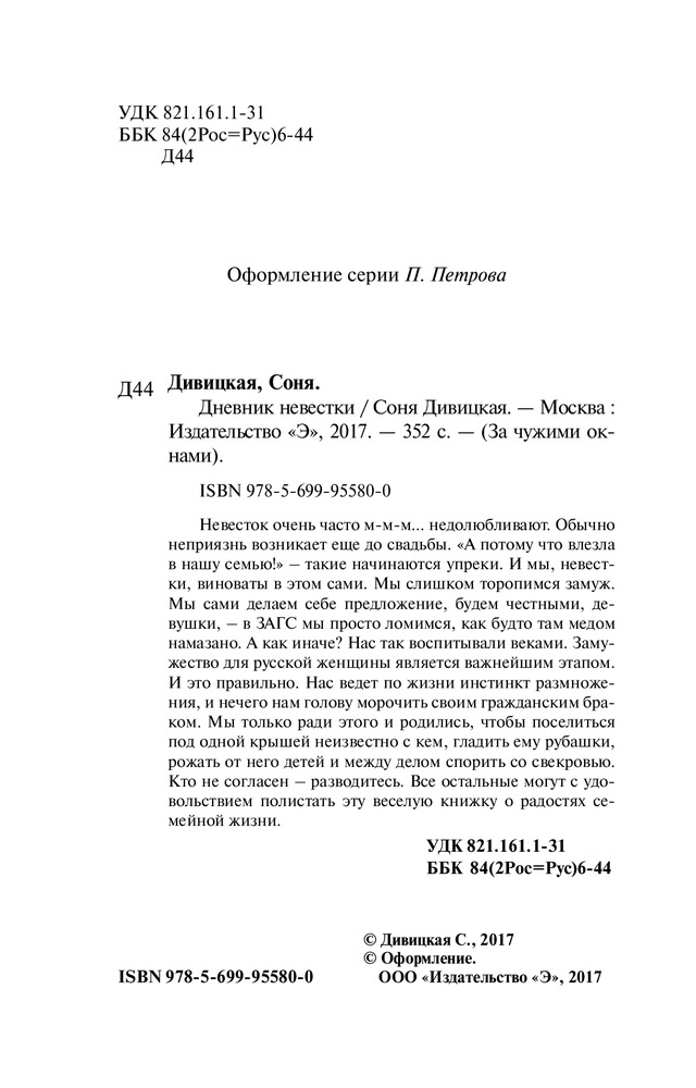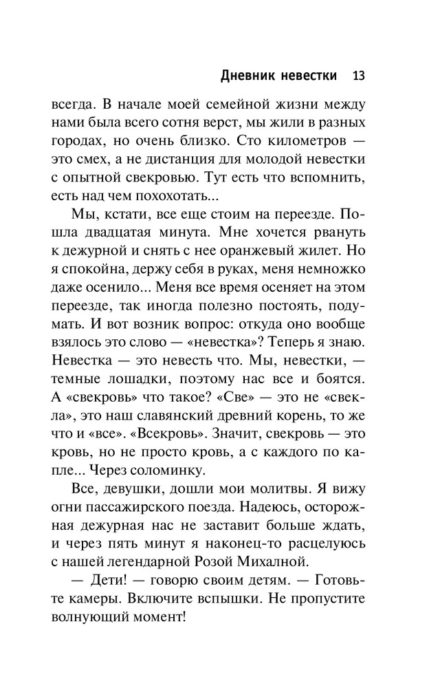 Дневник невесткиВ данный момент этот товар отсутствует в продаже. Возможно, у нас найдется аналогичный или похожий товар здесь. Серия: За чужими окнами. Проза М. Метлицкой и А. Борисовой Невесток очень часто м-м-м... недолюбливают. Обычно неприязнь возникает еще до свадьбы. «А потому что влезла в нашу семью!» — такие начинаются упреки. И мы, невестки, виноваты в этом сами. Мы слишком торопимся замуж. Мы сами делаем себе предложение, будем честными, девушки, — в ЗАГС мы просто ломимся, как будто там медом намазано. А как иначе? Нас так воспитывали веками. Замужество для русской женщины является важнейшим этапом. И это правильно. Нас ведет по жизни инстинкт размножения, и нечего нам голову морочить своим гражданским браком. Мы только ради этого и родились, чтобы поселиться под одной крышей неизвестно с кем, гладить ему рубашки, рожать от него детей и между делом спорить со свекровью. Кто не согласен — разводитесь. Все остальные могут с удовольствием полистать эту веселую книжку о радостях семейной жизни. |