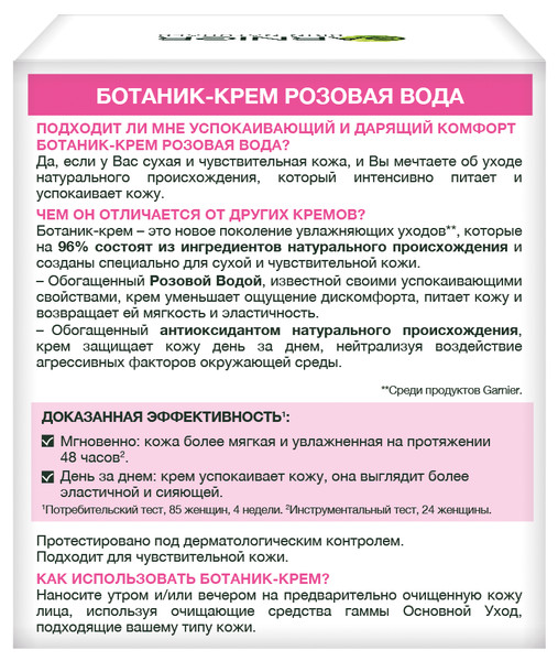 Garnier Крем-ботаник для лица увлажняющий «Розовая вода»В данный момент этот товар отсутствует в продаже. Возможно, у нас найдется аналогичный или похожий товар здесь. Серия: Основной Уход Ботаник-крем — это новое поколение увлажняющих уходов, которые на 96% состоят из ингредиентов натурального происхождения и созданы специально для сухой и чувствительной кожи. Обогащенный Розовой Водой, известной своими успокаивающими свойствами, крем уменьшает ощущение дискомфорта, питает кожу и возвращает ей мягкость и эластичность. — Обогащенный антиоксидантом натурального происхождения, крем защищает кожу день за днем, нейтрализуя воздействие агрессивных факторов окружающей среды. |