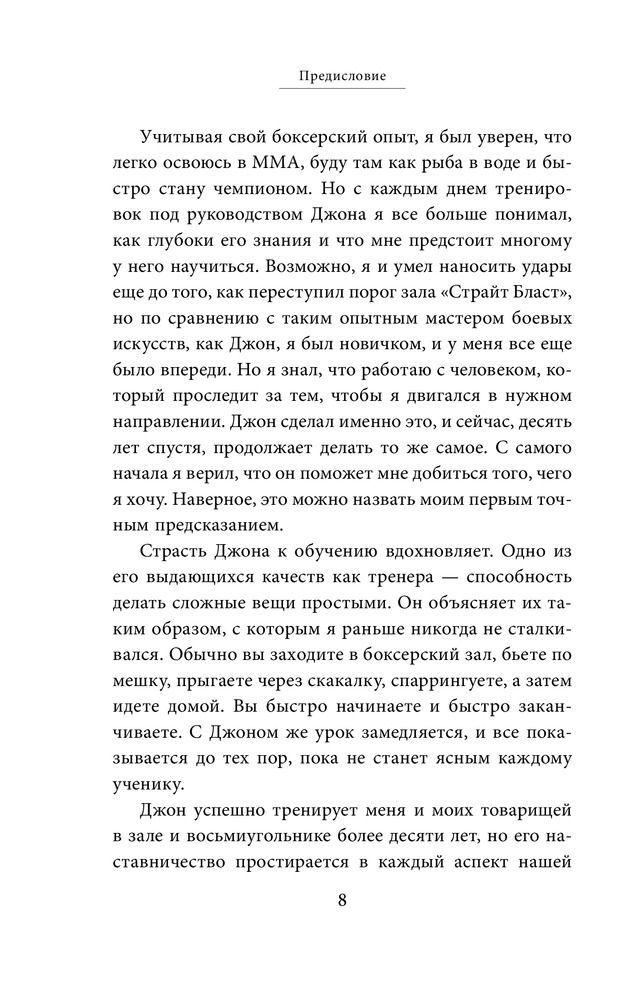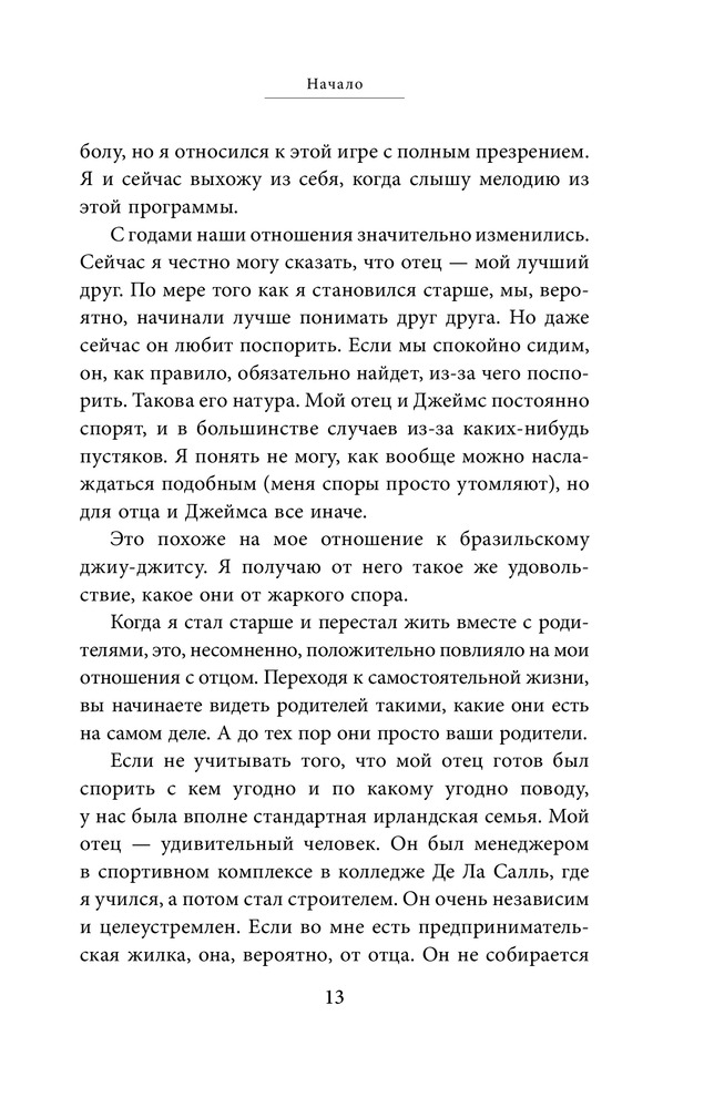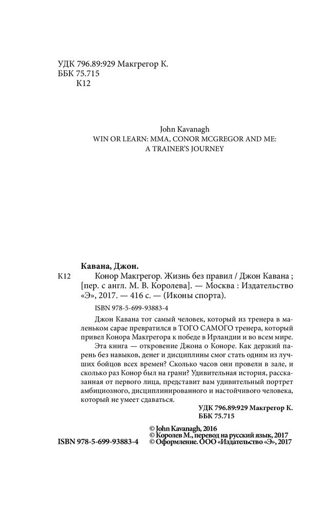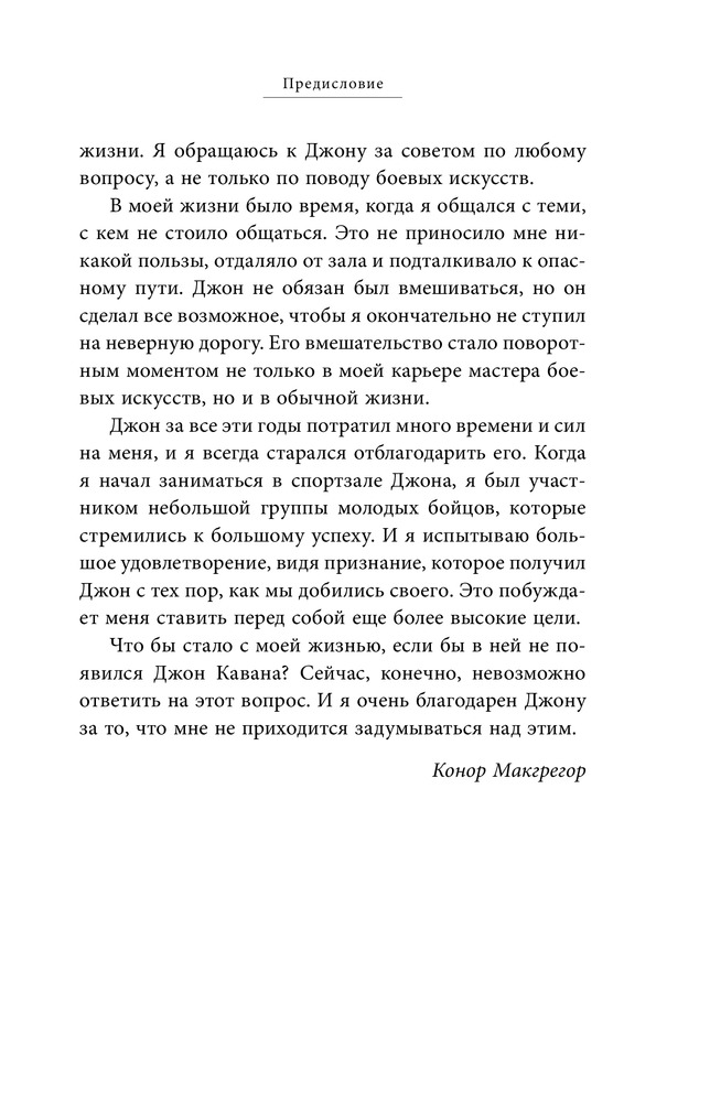 Интересная книга написанная тренером Конора Джоном Каванной.Джону удалось хорошо описать историю зарождения смешных единоборств в Ирландии,и путь Макгрегора от никому неизвестного ноунейма, до человека сумевшего взобраться на вершину олимпа в UFC.Но как по мне, личность Конора осталась раскрыта в этой книге не до конца.В данном случае, было бы уместно название "ММА в Ирландии от неизвестности к славе",а не то название которой озаглавили книгу.